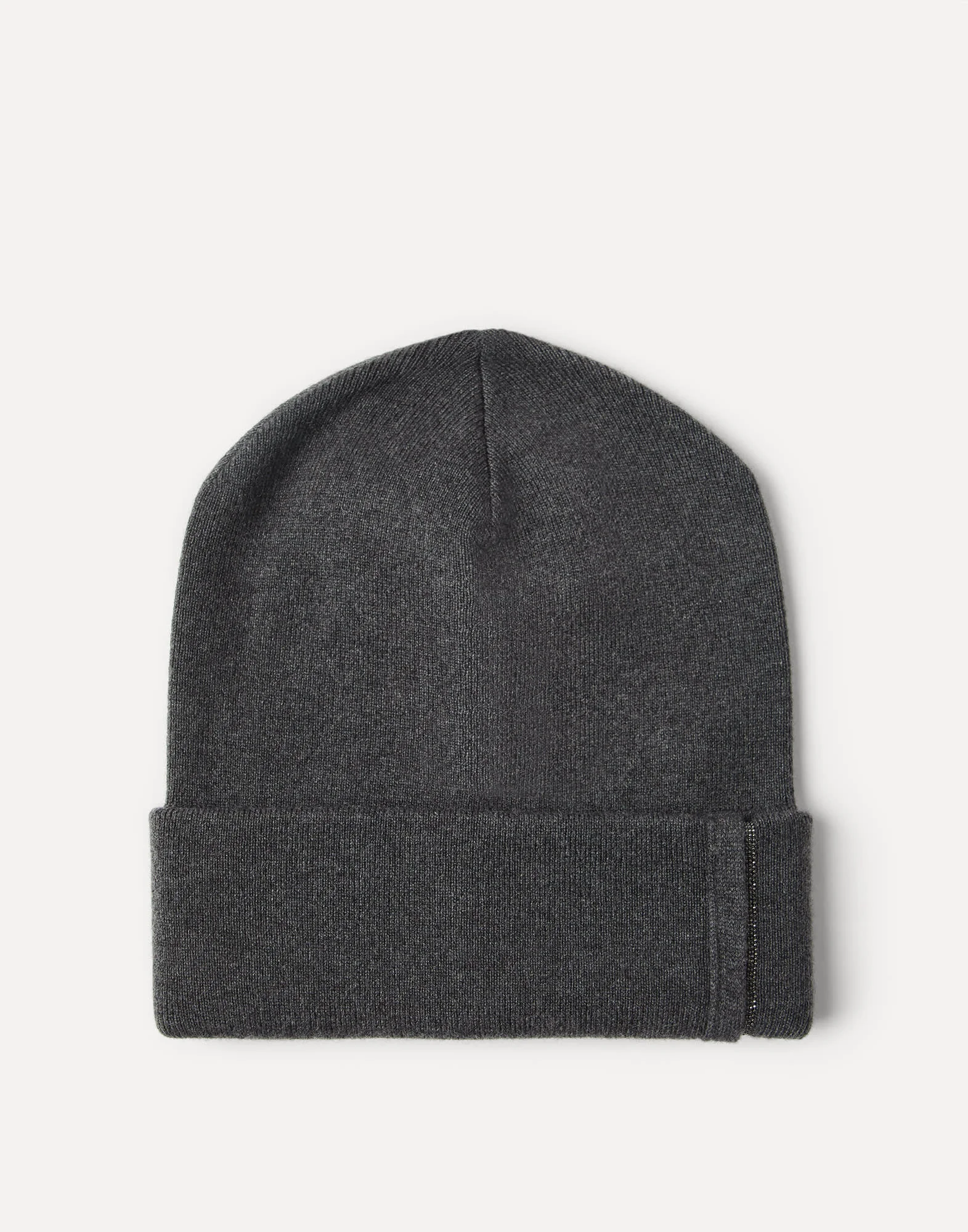 Refined pure cashmere yarn adds an elegant touch to this beanie, which is perfect for complementing a winter look with a sophisticated note. Classic rib knitting is paired with a band made of embroidered rows of shiny monili for a precious detail in true Brunello Cucinelli style. MATERIALS The noble cashmere fiber is characterized by an extreme fineness and also for its precious insulating qualities which guarantee warmth, providing coverage and lightness when worn. DETAILS Plain stitch Nickel-free monili decoration 100% CASHMERE