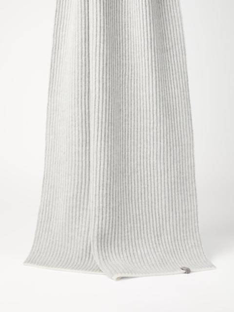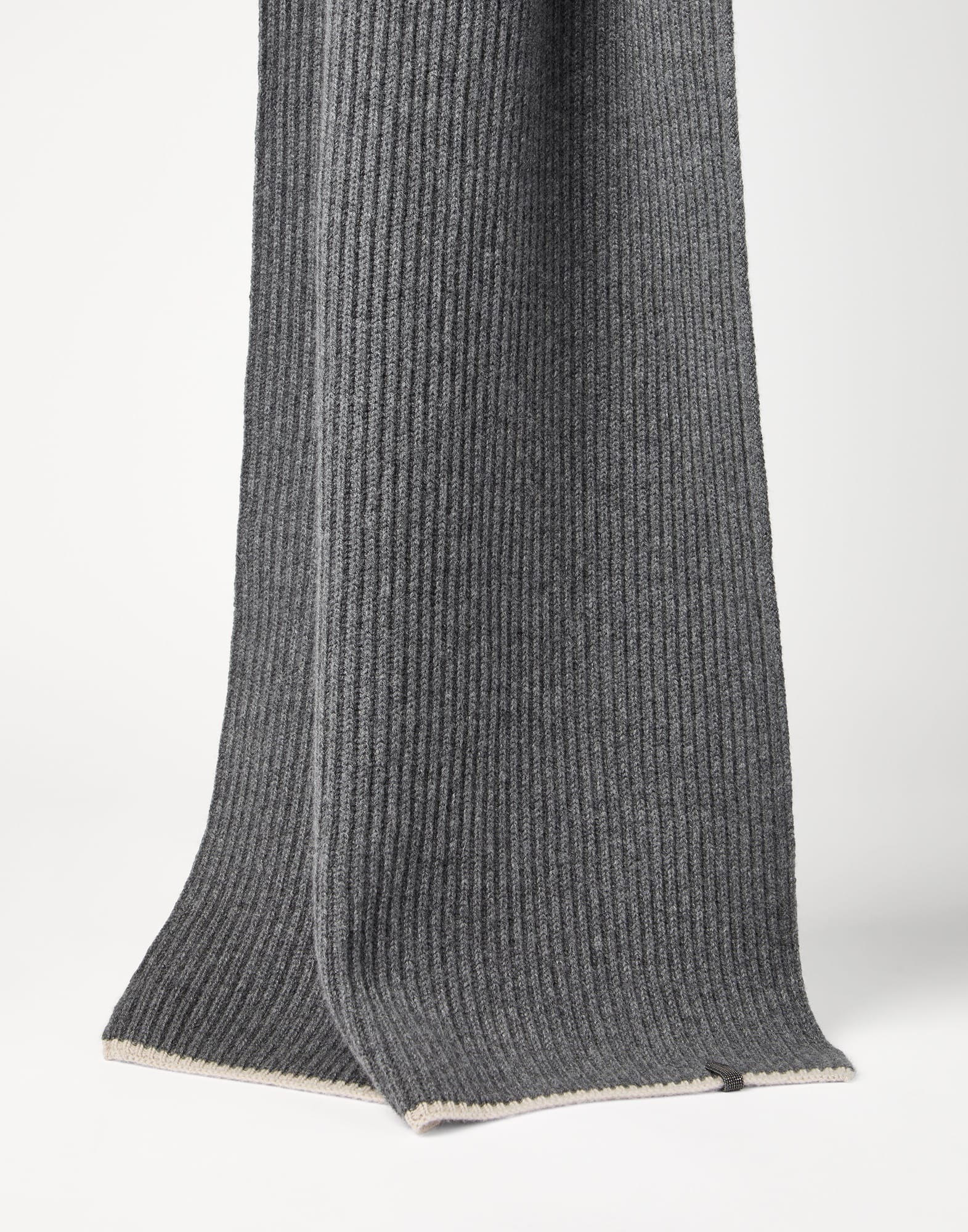 Cashmere, the iconic material of the Brunello Cucinelli collections, enhances the essential style of this knit scarf with its unmistakable sophistication. Timeless English rib knitting provides a comfortable sensation of softness and warmth, ideal for facing the winter. The shiny monili detail adds a feminine sparkle. MATERIALS The noble cashmere fiber is characterized by an extreme fineness and also for its precious insulating qualities which guarantee warmth, providing coverage and lightness when worn. DETAILS Scarf measures approx. 70 cm (27,56") x 235 cm (92,52") Rib knit Nickel-free monili decoration 100% CASHMERE
