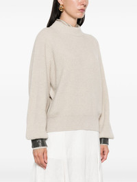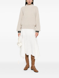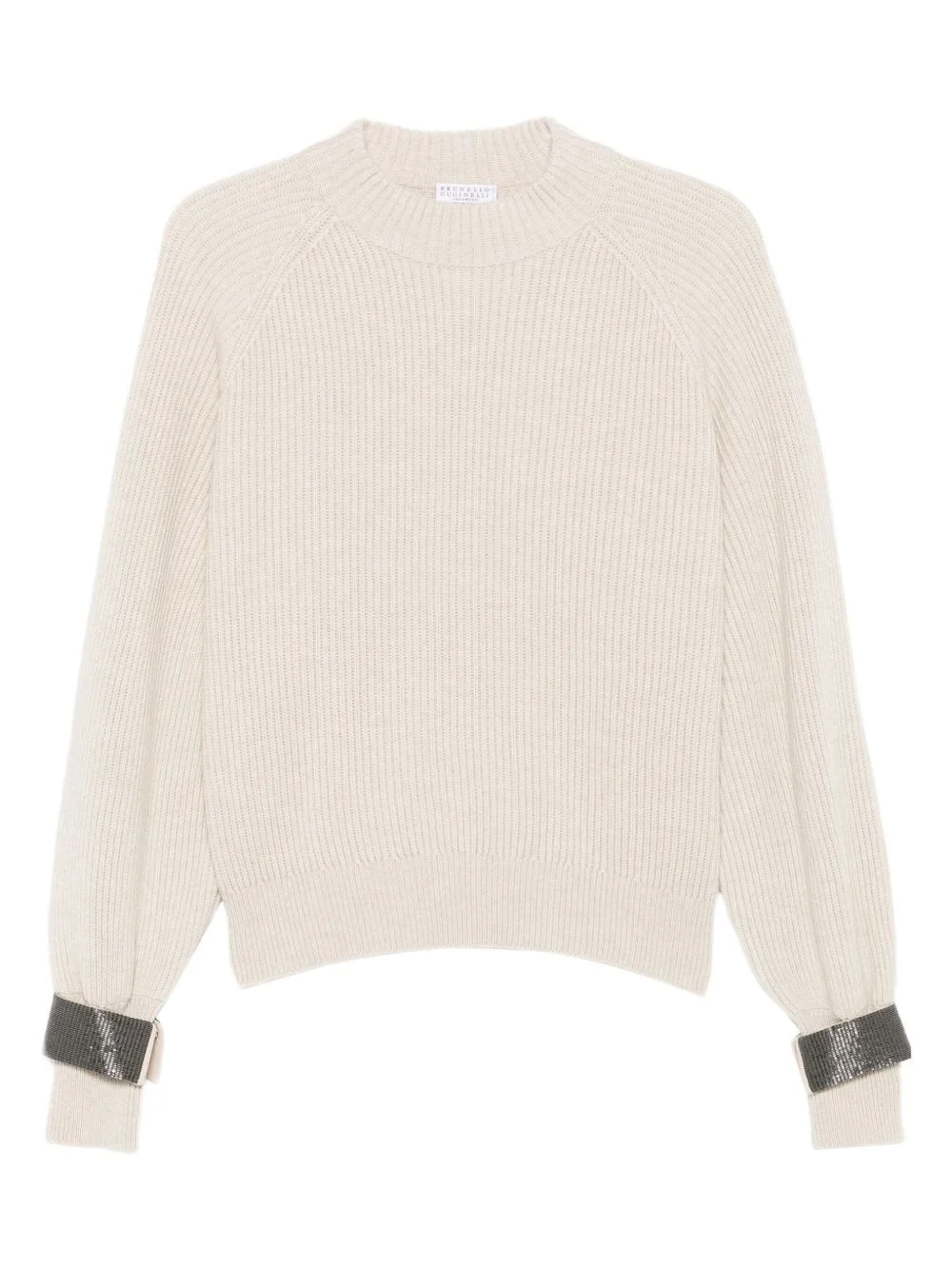 ribbed embellished-cuff sweater Highlights - Beige - Ribbed knit - Round neck - Long sleeves - Embellished cuffs Made in Italy Composition Eco Brass 100%, Cashmere 100%, Acetate 74%, Silk 26% SIZE & FIT Model measurements Height 5 ft 10 in(1.78 m) Bust/Chest 33.46 in(85 cm) Hips 36.22 in(92 cm) Waist 23.22 in(59 cm) Washing instructions Hand Wash