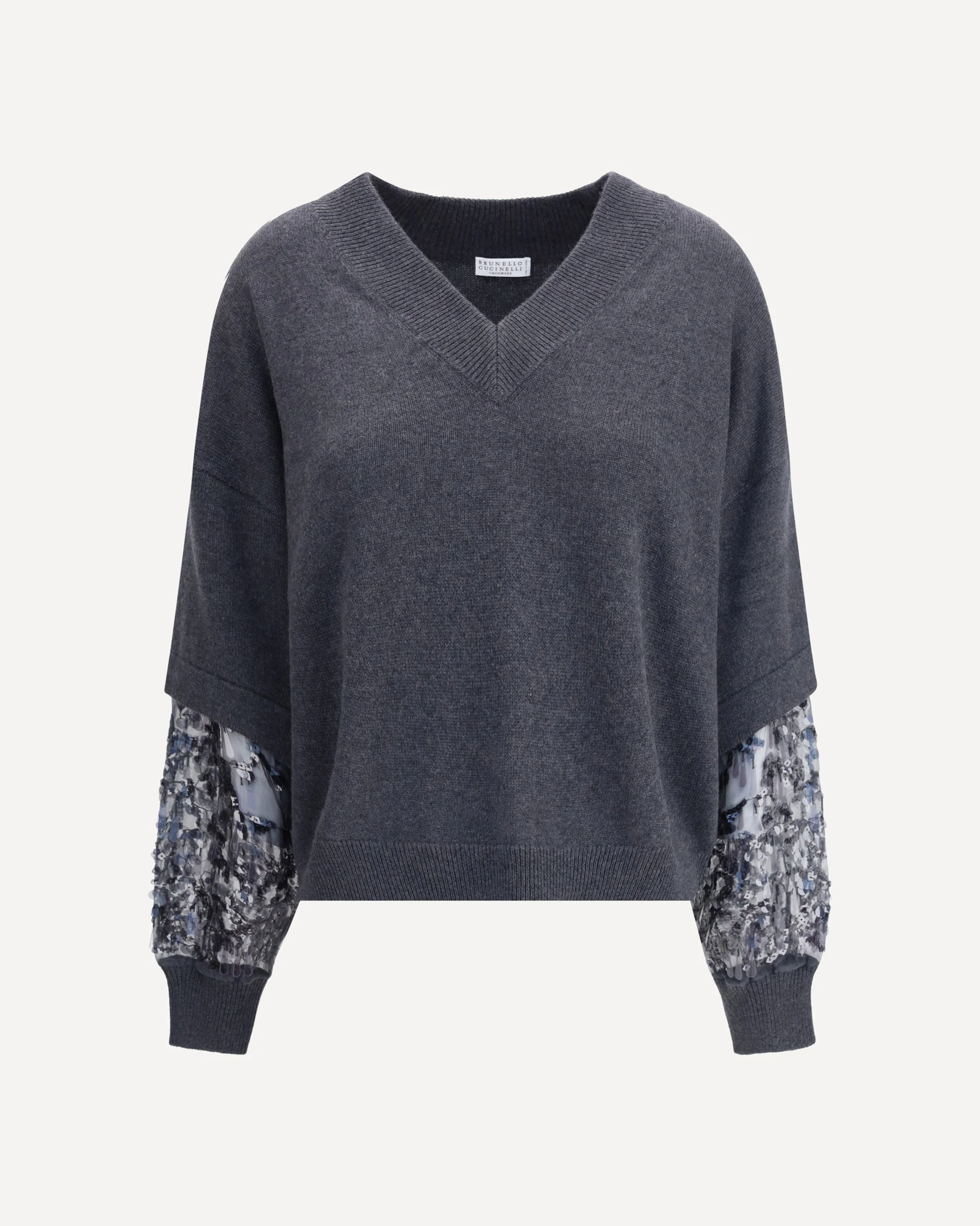 Brunello Cucinelli's cashmere Sweater is a refined and unique garment, featuring a V-neck and ribbed hem that enhance its elegant design. The special feature of this sweater is the double sleeves: the longer silk one is embellished with sequins that add a touch of sparkle, while the other maintains the classic ribbed style. Ribbed cuffs complete the look, giving a comfortable and sophisticated fit. A garment that combines luxury and originality flawlessly. DETAILS - Sku: M12730002_C2803 - Season: AW25 - Fit: Regular - Composition: GENERAL 100% Kashmir/capra Hircus - MADE IN ITALY