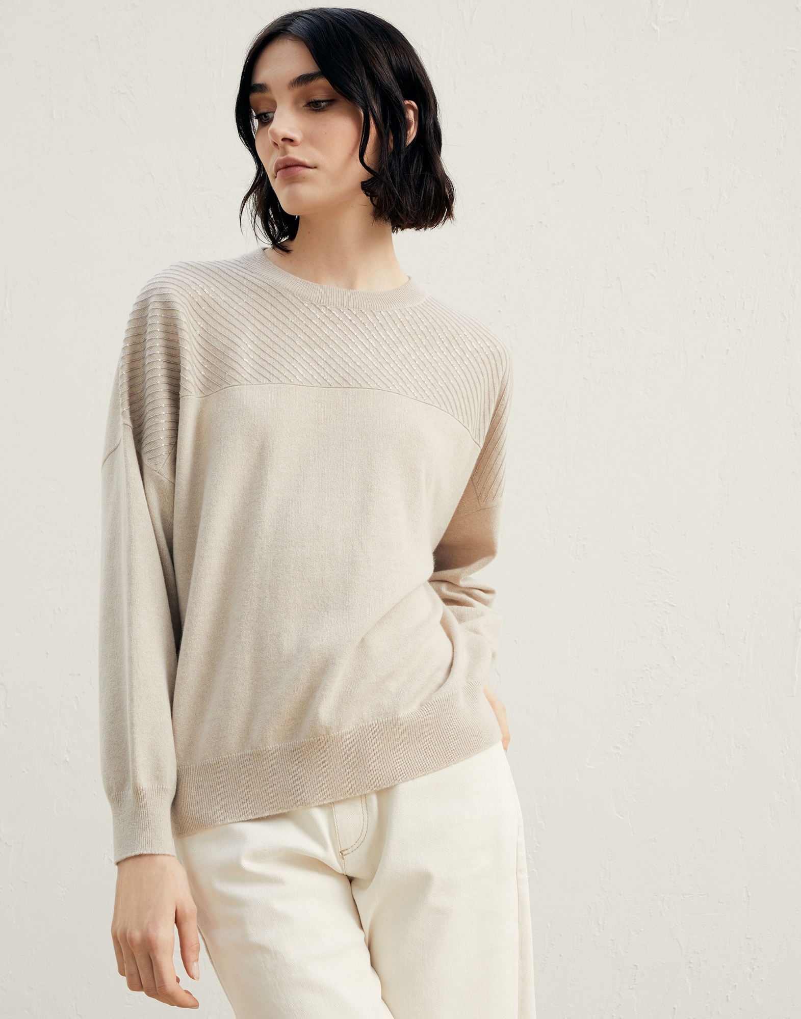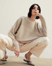 Knitwear is characterized by a well-balanced blend of the highest-quality materials, artisanal workmanship and the elegant, luxurious and discreet style that is distinctive to Brunello Cucinelli. Knit garments display ample creativity through their use of natural yarns and are enriched by seasonal colors and refined details that instill contemporary appeal into traditional stitches. MATERIALS The noble cashmere fiber is characterized by an extreme fineness and also for its precious insulating qualities which guarantee warmth, providing coverage and lightness when worn. DETAILS Designed in Solomeo and handcrafted in Italy 100% CASHMERE