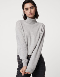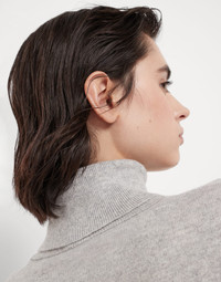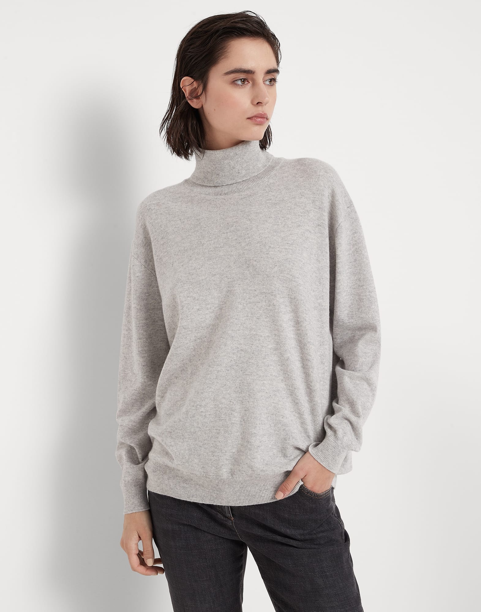 Soft and warm, this pure cashmere turtleneck sweater showcases a comfortable design updated with feminine details. The garment’s cozy appearance is paired with a thin embroidery made of fine shiny monili rows that illuminate the back of the neck with a precious note. Soft lines complete the sweater’s relaxed feel. MATERIALS The noble cashmere fiber is characterized by an extreme fineness and also for its precious insulating qualities which guarantee warmth, providing coverage and lightness when worn. DETAILS High collar Drop shoulder Plain stitch Nickel-free monili decoration 100% CASHMERE