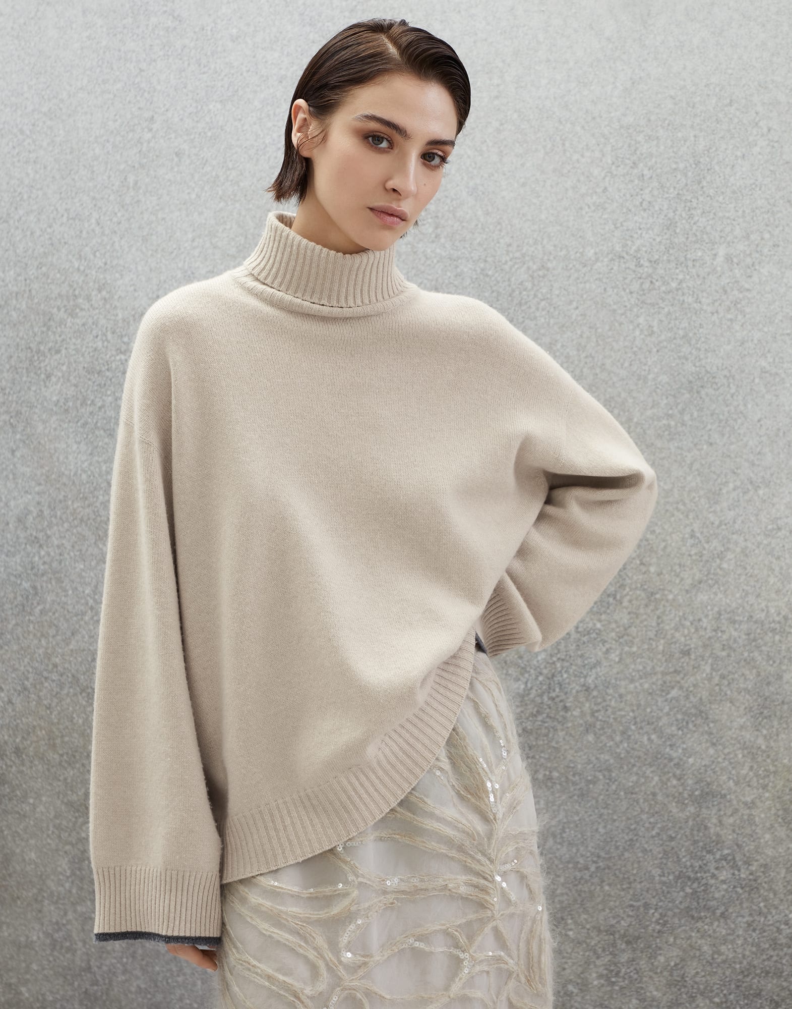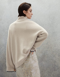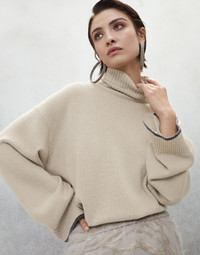 Precious yarns meet feminine details in this cashmere turtleneck sweater. The natural softness of the natural fiber highlights the relaxed and comfortable volumes, while a shiny monili embroidery brightens up the sleeve edges, lending a fine sparkling note to the garment, in pure Brunello Cucinelli style. MATERIALS The noble cashmere fiber is characterized by an extreme fineness and also for its precious insulating qualities which guarantee warmth, providing coverage and lightness when worn. DETAILS High collar Drop shoulder Wide sleeve Plain stitch Nickel-free monili decoration 100% CASHMERE