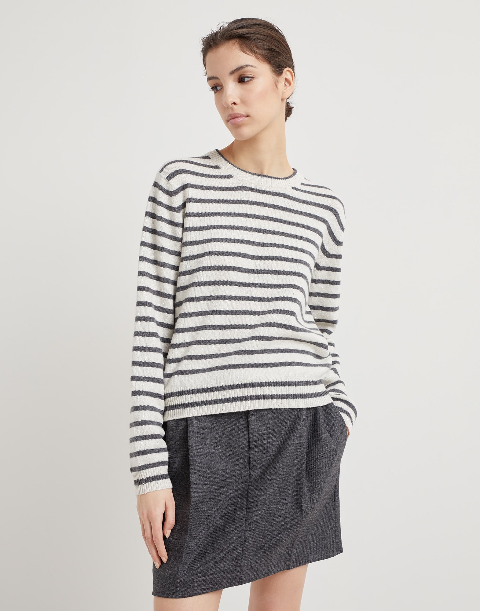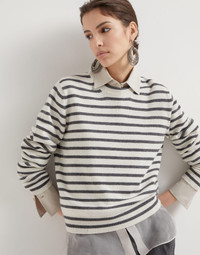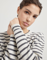 The casual, versatile feel of stripes meets the feminine look of cashmere, virgin wool and silk Sparkling & Dazzling yarn. This crew-neck sweater combines the classic two-tone design in the season's colors with the shimmering texture created by the lamé thread and the strand of sequins that run throughout the silhouette. MATERIALS Manufacturing of the cashmere and wool yarn enhances the noble qualities of the natural fibers to provide a lightweight and cozy sensation when worn. The delicate metallic effect of the lamé thread and the strand of pailettes enrich the knitting with sparkling reflections. DETAILS Crew-neck Regular sleeve Plain stitch 47% CASHMERE, 47% WOOL, 4% POLYESTER, 2% NYLON