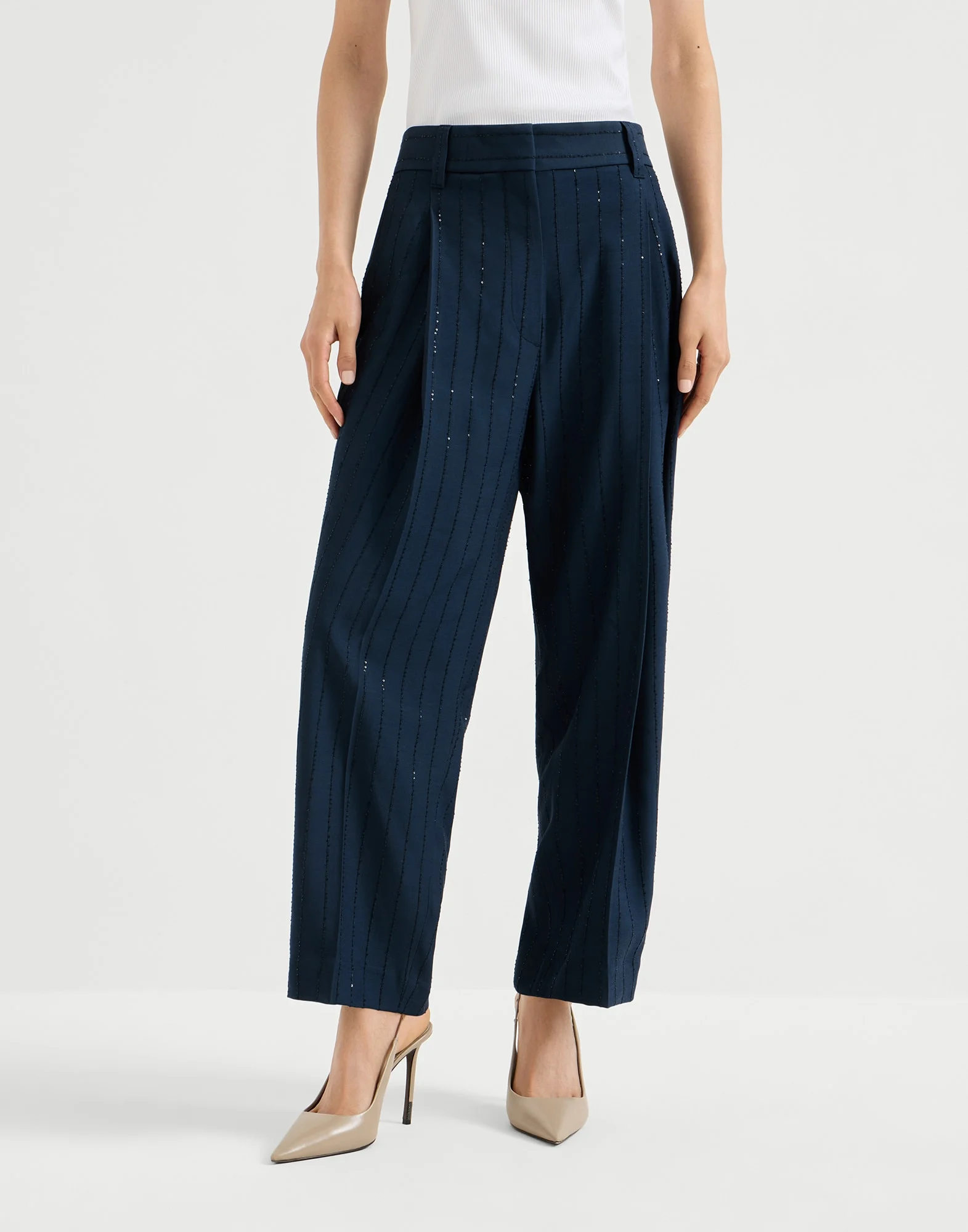 Elements of masculine elegance enrich the relaxed silhouette of these dazzling chalkstripe slouchy trousers. The double pleats enhance the tailored construction of the garment, embellished with shiny sequins that create a refined stripe with a timeless allure. A precious monili embroidery completes the trousers with a sparkling note in true Brunello Cucinelli style. MATERIALS The lightweight viscose-blend twill has a very soft, fluid hand. DETAILS Zip closure with metal hooks and backing button Slanted front pockets Pleat Back welt pockets Plain hem Nickel-free monili decoration 95% VISCOSE, 5% NYLON