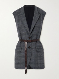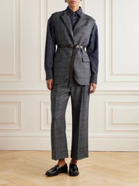 Brunello Cucinelli's vest is woven with heritage Prince of Wales checks - match yours to those on the coordinating pants. It's made from wool and has a slightly loose, longline shape and detachable leather belt that cinches the waist. The rows of Monili beads under the back collar are a brand signature. Size & Fit - Fits true to size, take your normal size - The model is wearing a size larger to achieve the runway look - Designed for a slightly loose fit, use the tie belt to cinch in at the waist - Mid-weight, non-stretchy fabric - Model is 180cm/ 5'11" and is wearing an IT 42 Model measurements: - Bust: 85cm/ 33.5" - Waist: 62cm/ 24.5" - Hip: 88cm/ 34.5" Details & Care - Tonal-blue and gray wool, brown leather - Button fastenings through front - 100% wool; trim: 100% leather (Cow)