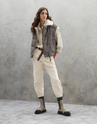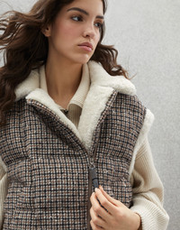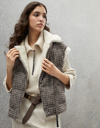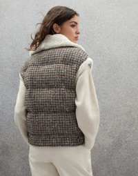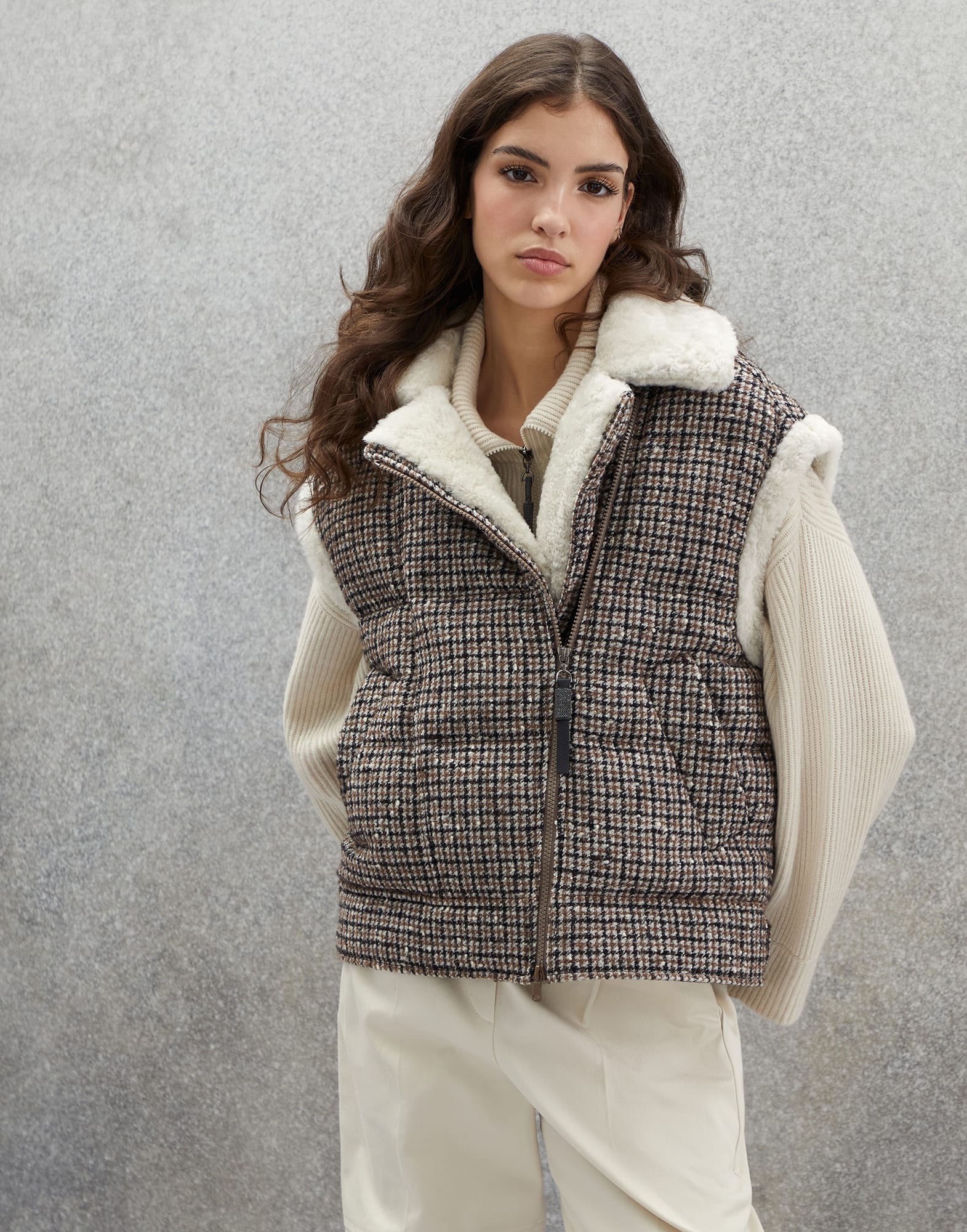 The iconic lines of the biker jacket update the look of this wool and alpaca check down vest with shearling inserts. The plush padding emphasizes the slightly oversized silhouette and highlights the classic-inspired fabric’s soft and slightly voluminous texture. At the same time, soft shearling inserts enrich the sleeves and the collar, introducing a very sophisticated material contrast. A precious monili embroidery detail illuminates the zipper pull and complements the garment with a feminine note. MATERIALS Refined virgin wool provides the garment with a soft hand, while the airy effect of alpaca adds volume. The wool and alpaca fibers enrich the menswear pattern. DETAILS Zipper and buttons closure Water-resistant nylon lining Collar with insert Hand pockets with snap Side buttons for fit adjustment Padding made from high-quality natural materials: 90% goose down, 10% goose feathers Nickel-free monili decoration 63% WOOL, 25% ALPACA, 12% NYLON
