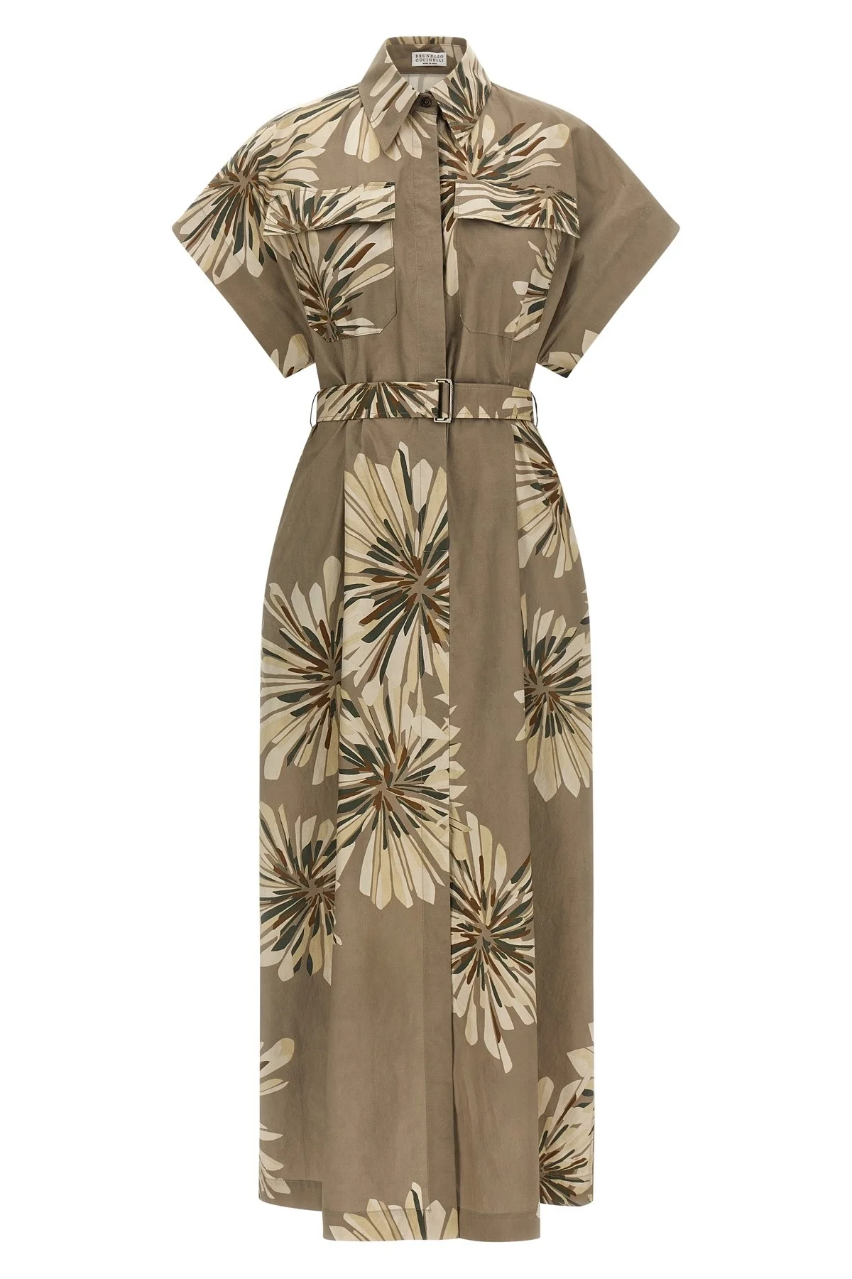 cod. MQ197A5475C009 Long dress in floral print cotton poplin with chemisier style, front and back pincer, hidden button closure and front split, pockets, short sleeves, unlined, removable belt. Color: Green Size & Fit: true to size fit Composition: 100% cotton Made in: Italy