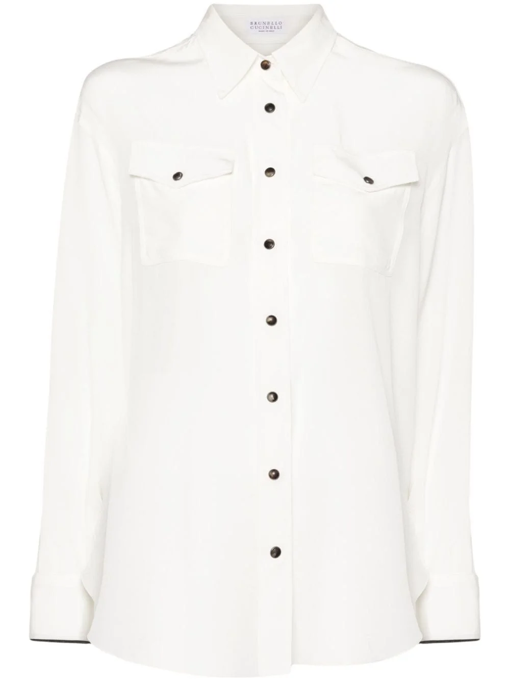 chest-pockets silk shirt Highlights - Almond beige - Silk - Classic collar - Long sleeves with buttoned cuffs - Signature monili chain detail - Two button-fastening chest pockets - Curved hem - Front button fastening Made in Italy Composition Silk 100%, Eco Brass 100% SIZE & FIT Model measurements Height 5 ft 10 in(1.78 m) Bust/Chest 32.67 in(83 cm) Hips 35.43 in(90 cm) Waist 23.22 in(59 cm) FittingInformation Designed to be unstructured, offering a loose fit throughout Made from a lightweight non-stretch fabric This piece fits true to size – take your usual size