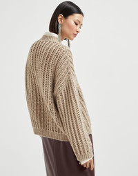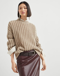 Traditional workmanship and precious materials elevate the wintry feel of this sweater in cashmere Feather yarn. The openwork rib knitting highlights the refinement of the natural yarn, giving the design a cozy, three-dimensional appearance. The silhouette offers comfortable proportions with slightly dropped shoulders and generous sleeves, creating a relaxed feel. MATERIALS The lightweight pure cashmere Feather yarn is characterized by an extremely soft hand. A compact and voluminous texture makes the yarn warm and cozy. DETAILS Crew-neck Drop shoulder Wide sleeve Rib knit 100% CASHMERE