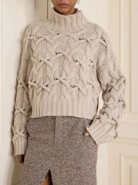 Brunello Cucinelli's sweater has a unique interlocking cable-knit finish that gives it a cool 3D effect. It's made from soft cashmere and has a chunky turtleneck and ribbed trims. Wear yours with a pair of the label's relaxed tailoring. Size & Fit - Fits true to size, take your normal size - The model is wearing a size larger to achieve the runway look - Designed for a relaxed fit - Mid-weight knit - Model is 180cm/ 5'11" and is wearing a size Medium Model measurements: - Bust: 85cm/ 33.5" - Waist: 62cm/ 24.5" - Hip: 88cm/ 34.5" Details & Care - Beige cashmere - Slips on - 100% cashmere - Dry clean