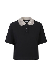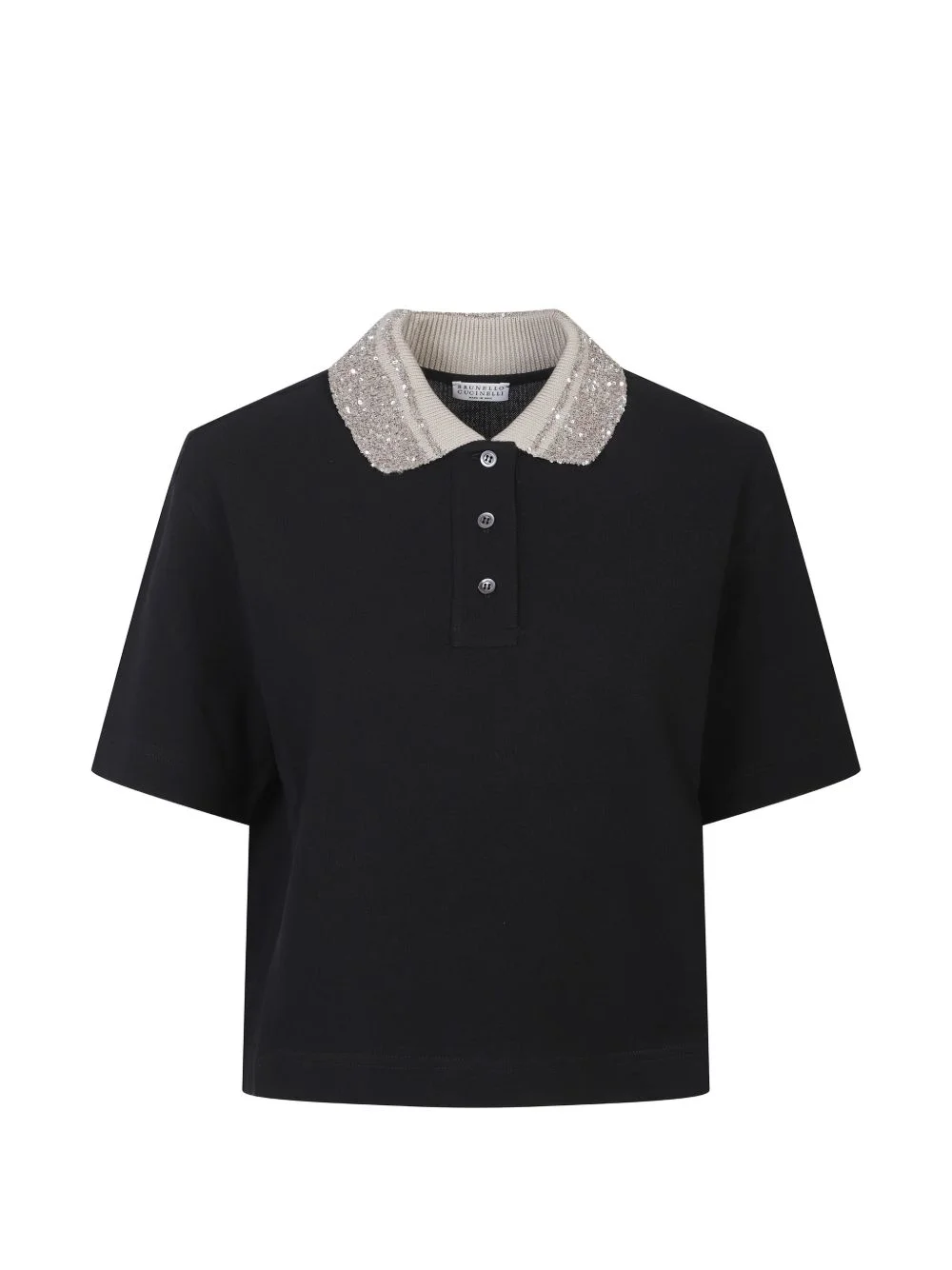 collar-embellished polo top Highlights - Black - Sequin embellishment - Button fastening - Short sleeves - Ribbed collar Made in Italy Composition Fabric 100% Washing instructions Read Manufacturer Guidelines