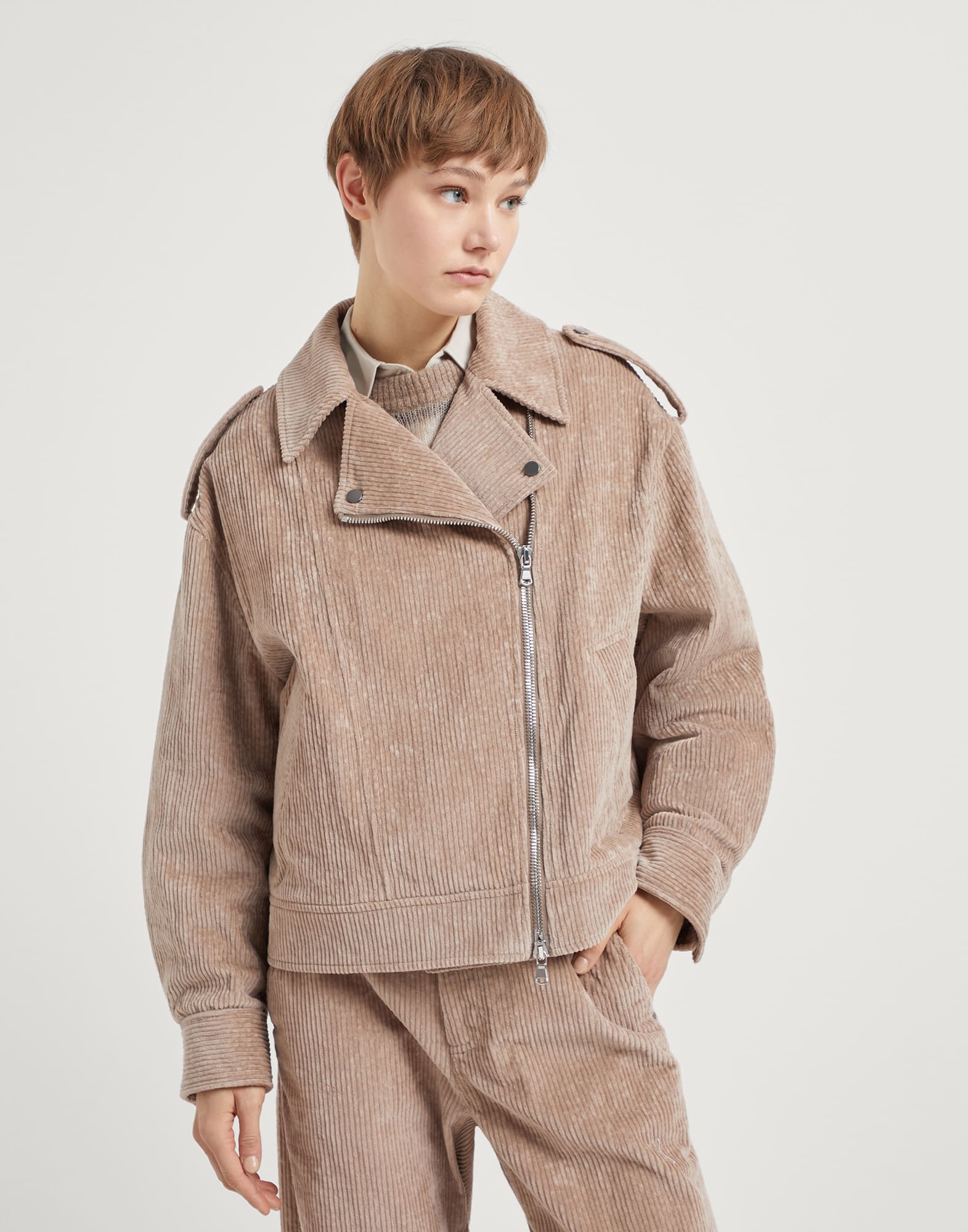 The distinct casual look of comfort cotton corduroy meets the iconic lines of the biker jacket. The classic menswear silhouette, recognizable by the wide lapel, the side zipper closure and the epaulettes, is reinterpreted in an elegant way thanks to the shiny monili details that illuminate the loops at the bottom. MATERIALS The cotton corduroy offers a smooth, velvety and compact hand, showcasing the characteristic color and three-dimensional texture of the knit stripes. The slight presence of an elastic fiber helps to make the fabric even and comfortable. The silk-blend lining perfects the fit. DETAILS Two-way zip closure Silk-blend crêpe lining Biker-jacket style neck Hand pockets with button Epaulettes with buttons Button cuffs Button at hem Nickel-free monili decoration 99% COTTON, 1% ELASTANE