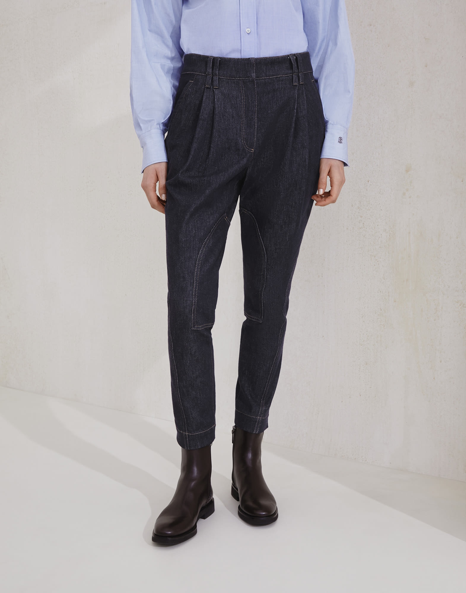 Equestrian inspiration and materials with a relaxed attitude come together in these new no-fade denim equestrian trousers. The double pleats at the top add volume and structure to the garment, which tapers down the leg, hugging and slimming the silhouette. The shiny monili embroidery provides an elegant sparkle in true Brunello Cucinelli style. MATERIALS The pure cotton denim is a refined Japanese fabric, characterized by a lightweight texture and a dark color that does not lighten after washing. A small percentage of synthetic fiber helps to make the fabric comfortable to wear. DETAILS Zip closure with metal hooks and backing button Slanted front pockets Double pleat Back welt pockets with button Nickel-free monili decoration 99% COTTON, 1% ELASTANE