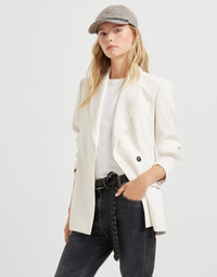 This new comfort viscose couture twill blazer combines a retro allure with feminine details. The model features tailored peak lapels and a slightly loose fit with generous shoulders and a regular waist. The refined monili embroidery adds a delicate sparkling touch. MATERIALS Comfort viscose couture twill is an elegant, fluid fabric made with a small percentage of synthetic fiber to provide added comfort. DETAILS Horn button closure Silk-blend crepe lining Peak lapel Chest pocket Welt pockets with flap and chest pocket Cuffs have four horn buttons Nickel-free monili decoration 98% VISCOSE, 2% ELASTANE