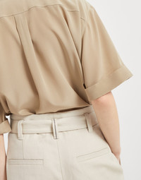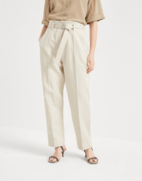 Relaxed proportions and refined materials come together in these new Corset cigarette trousers. The garment stands out for its very elegant casual, feminine appearance, characterized by straight, clean lines highlighted by the tailored crease on the front. Enriched with a precious monili embroidery, the iconic element of the Brunello Cucinelli collections, the waist belt completes the style of the trousers. MATERIALS The cotton and linen canvas features a rustic yet clean appearance. It is a fabric with a very rich, crisp masculine feel. The soft hand is achieved with the finish used to obtain a powdery color. DETAILS Zip closure with metal hook and backing button Detachable ring belt Front pockets Back pockets Unlined Nickel-free monili decoration 59% COTTON, 41% LINEN