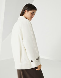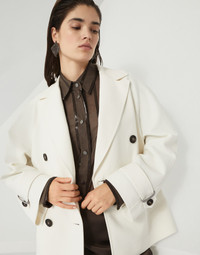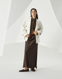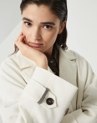 Timeless elegance and refined materials define the style of this cotton and linen cavalry caban jacket. Borrowed from menswear blazers, the double-breasted silhouette and the classic lapels are paired with a shiny monili embroidery near the cuffs, completing the garment with a radiant sparkle in true Brunello Cucinelli style. MATERIALS Cavalry is a refined fabric with a clean, structured and slightly three-dimensional feel. Made of a light cotton and linen blend, it provides a nice feeling of crispness when worn, making it perfect for the spring. DETAILS Horn button closure Silk-blend crepe lining Lapel collar Hand pockets Adjustable button cuffs Nickel-free monili decoration 79% COTTON, 21% LINEN
