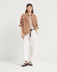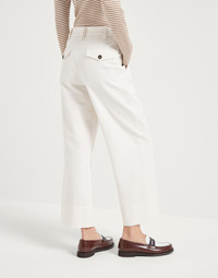Refined cotton and linen cover defines the summery feel of these new Chino Crop trousers. The effortlessly elegant garment features a boxy silhouette with a "cropped" cut that descends straight down the leg, a perfect balance between comfort and style. A shiny monili embroidery on the rear belt loop adds a feminine sparkle in true Brunello Cucinelli style. MATERIALS The cover is characterized by a visible diagonal weave, slightly lessened by the blend of linen and cotton. It is a fabric with a very compact, sporty look, which maintains the garment’s shape, while preserving its softness. DETAILS Zip closure with metal hooks and backing button Front pockets Back pockets with flap and button Unlined Nickel-free monili decoration 76% COTTON, 24% LINEN
