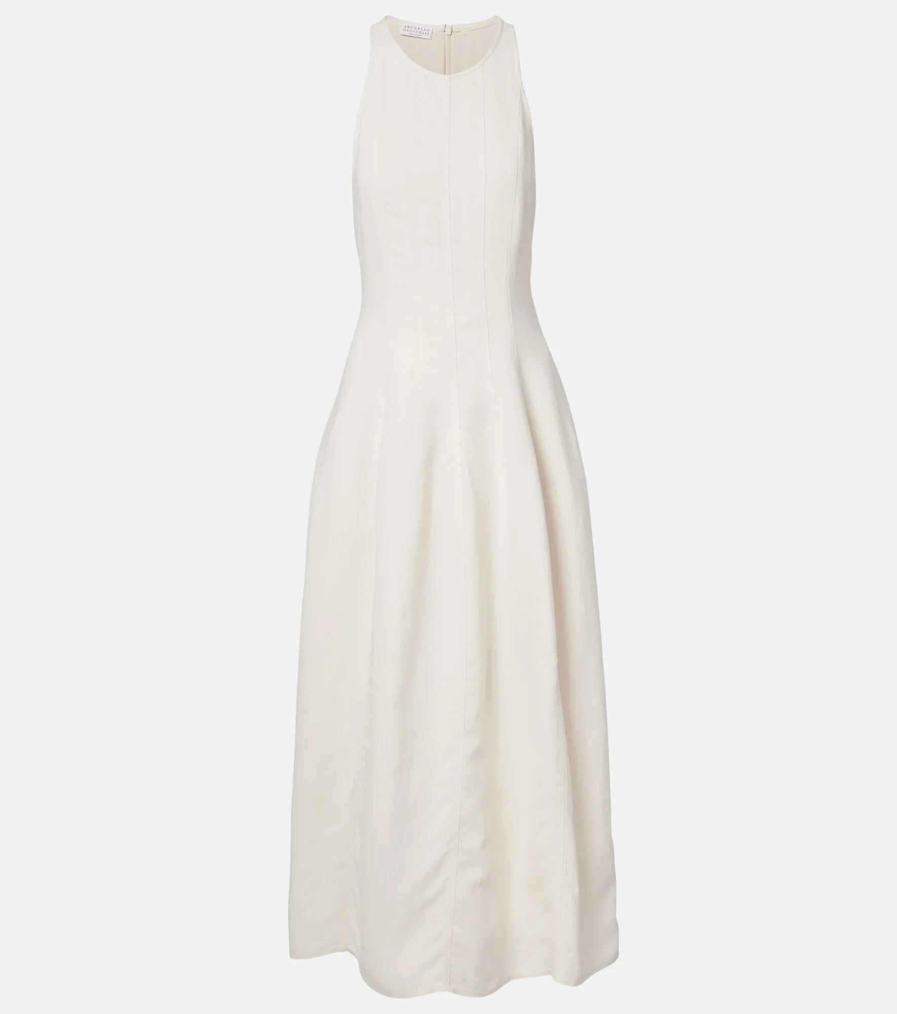 Brunello Cucinelli's designs are created in Solomeo, a medieval hamlet whose art and traditions are woven into the house's every fiber. This maxi dress is made from cotton and silk and features a concealed zipper fastening at the back. Product Details - Material: 72% cotton, 28% silk - Care instructions: dry clean - Made in Italy - Color: white - Designer color name: Cream - Lining: 74% acetate, 26% silk - Closure: concealed zipped back - Item number: P01143581 Size & Fit - True to size - Cinched waist - Non-stretchy fabric - Height of model is 177cm-69.5" and wears a size XS