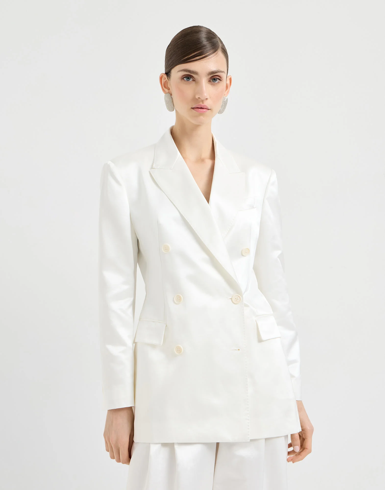 Tailored lines and refined fabrics define the style of this cotton and silk satin blazer. The natural fluidity and sheen of the fabric is paired with a slightly oversized fit, emphasized by the wide peak lapels, double-breasted closure and pronounced shoulders, accentuating the silhouette. The delicate monili embellishment completes the garment with an elegant, feminine sparkle. MATERIALS Cotton an silk satin combines the softness and sheen of silk with the resistance and breathability of cotton, while the fluid twill stands out for its light, very fluid and, at the same time slightly crisp appearance. DETAILS Corozo buttons closure Peak lapel Cuffs with corozo buttons Welt pockets with flap and chest pocket Silk-blend crepe lining Single back vent Nickel-free monili decoration 68% COTTON, 32% SILK