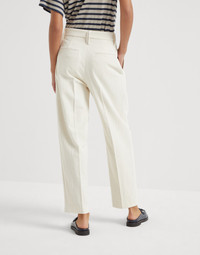 A vintage style reinterpreted with a modern twist characterizes these techno cotton and virgin wool gabardine Slouchy trousers. The fluid and lightweight texture of the fabric is combined with a loose silhouette, that recalls classic sartorial double pleated designs. A monili detail, the iconic embellishment of the Brunello Cucinelli collections, illuminates the rear belt loop, lending a subtle sparkling touch to the garment. MATERIALS The combination of virgin wool and cotton fibers gives the fabric a dry hand and makes its texture light and fluid. A very small percentage of synthetic fiber provides added comfort. DETAILS Zip closure with metal hooks and backing button Front pockets Back welt pockets Pleat Nickel-free monili decoration 78% COTTON, 17% VIRGIN WOOL, 5% NYLON