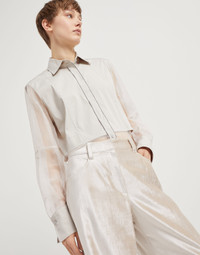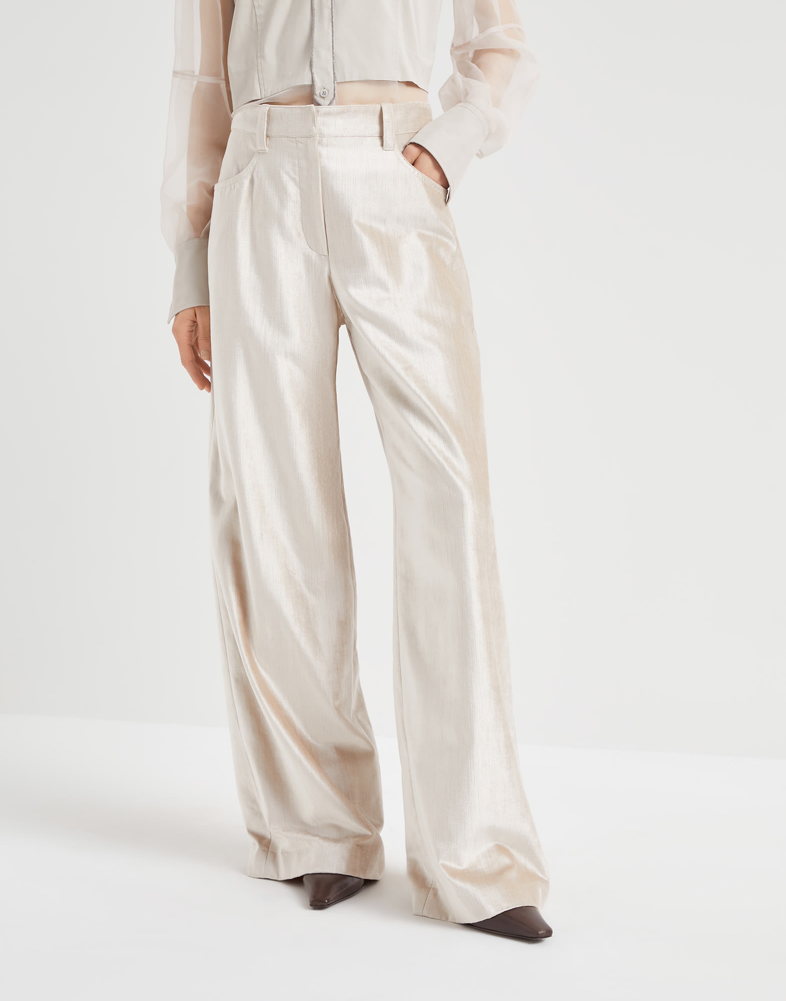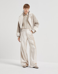 Fluid lines and refined materials make the silhouette of these Loose trousers in cotton and viscose Sleek velvet modern and sophisticated. The material’s soft texture is paired with the color’s slightly shimmering effect, while the relaxed proportions give the garment a contemporary allure. MATERIALS Cotton and viscose Sleek velvet is a light, comfortable fabric with a glossy appearance and a smooth, extremely soft hand. These characteristics make the material very fluid and pleasant to wear. DETAILS Zip closure with metal hook and backing button Front pockets Back patch pockets 58% COTTON, 42% VISCOSE