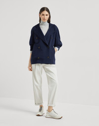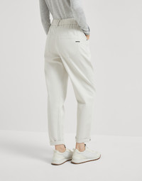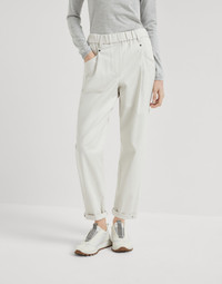 Relaxed lines meet classic-inspired details and lightweight materials in these Baggy trousers in stretch cotton cover. The elasticized waistband adds a sporty touch to the garment and gathers the volume that descends straight down the leg, while the pleat detail stands out against the casual fabric, introducing a sophisticated design contrast. A precious monili label illuminates the edge of one of the rear pockets with a sparkling, feminine touch in true Brunello Cucinelli style. MATERIALS Cover is a twill fabric characterized by a slightly pronounced diagonal texture. The sporty feel of the fabric is balanced by the yarn dyeing, which disperses the colors of the season with an intense and sophisticated look. A very small percentage of spandex provides added comfort. DETAILS Pull-up trousers Front pockets with watch pocket Back patch pockets Nickel-free monili decoration 97% COTTON, 3% ELASTANE