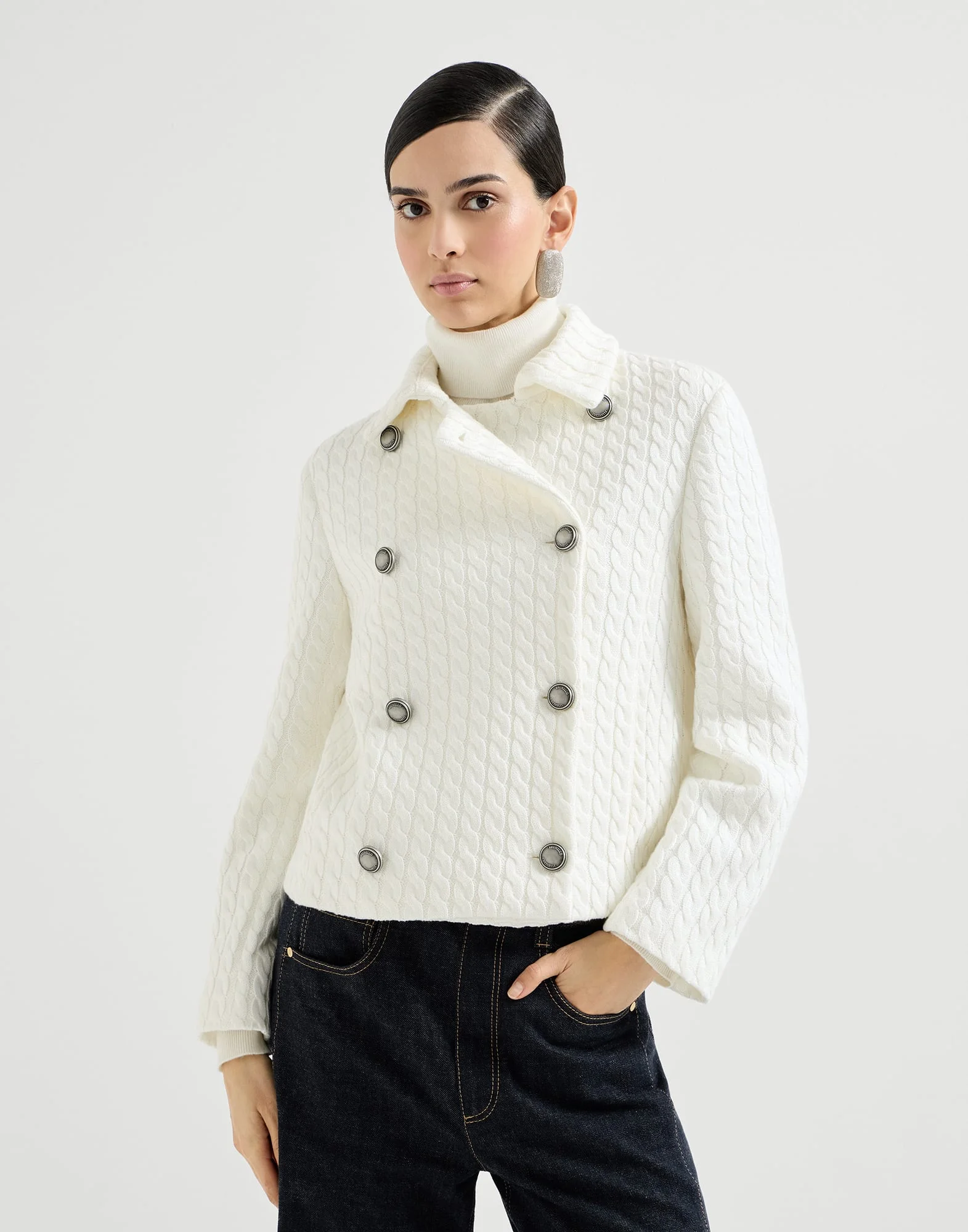 Tailored style and iconic knitting techniques come together in this cotton cable knit blazer. Inspired by classic caban jackets, the silhouette features straight lines and a double-breasted closure, reinterpreting a classic of masculine elegance in a feminine way. The cozy texture of the cable knitting provides softness and textural depth, giving the garment a balance between structure and comfort. The shiny monili embroidery completes the blazer with a radiant sparkle in true Brunello Cucinelli style. MATERIALS The cotton yarn is soft, lightweight and breathable, making it ideal for summer and spring garments. The three-dimensional appearance of the cable knitting stands out for its sturdy yet airy texture, offering a soft, pleasant feel. DETAILS Metal button closure Shirt-style collar Vertical hand pockets Cable knit Lined Nickel-free monili decoration 100% COTTON