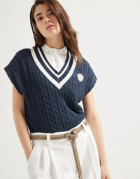 A sporty attitude meets fine yarns in this cotton knit T-shirt. Classic cable knitting gives the garment a three-dimensional look and enhances the softness of the yarn, while the contrasting insert on the V-neck adds an Active element to the design. The Solomeo heraldic coat of arms stands out on the chest, complementing the T-shirt with an iconic detail. MATERIALS The cotton yarn is soft, lightweight and breathable, making it ideal for summer and spring garments. DETAILS V-neck Drop shoulder Wide sleeve Rib knit hem Cable knit 100% COTTON