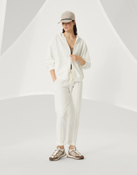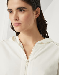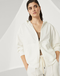 Refined Brunello Cucinelli materials are paired with the casual style of the Travelwear line, dedicated to moments of relaxation and leisure. The Active inspiration of this lightweight stretch cotton French terry hooded sweatshirt is enriched with a precious detail: the zipper is illuminated by fine shiny trails of monili embroideries that run along the garment for a distinctly feminine touch. MATERIALS The stretch characteristic of the lightweight cotton French terry makes the garment comfortable to wear. DETAILS Two-way zip closure Hood Drop shoulder Wide sleeve Hand pockets Nickel-free monili decoration 98% COTTON, 2% ELASTANE