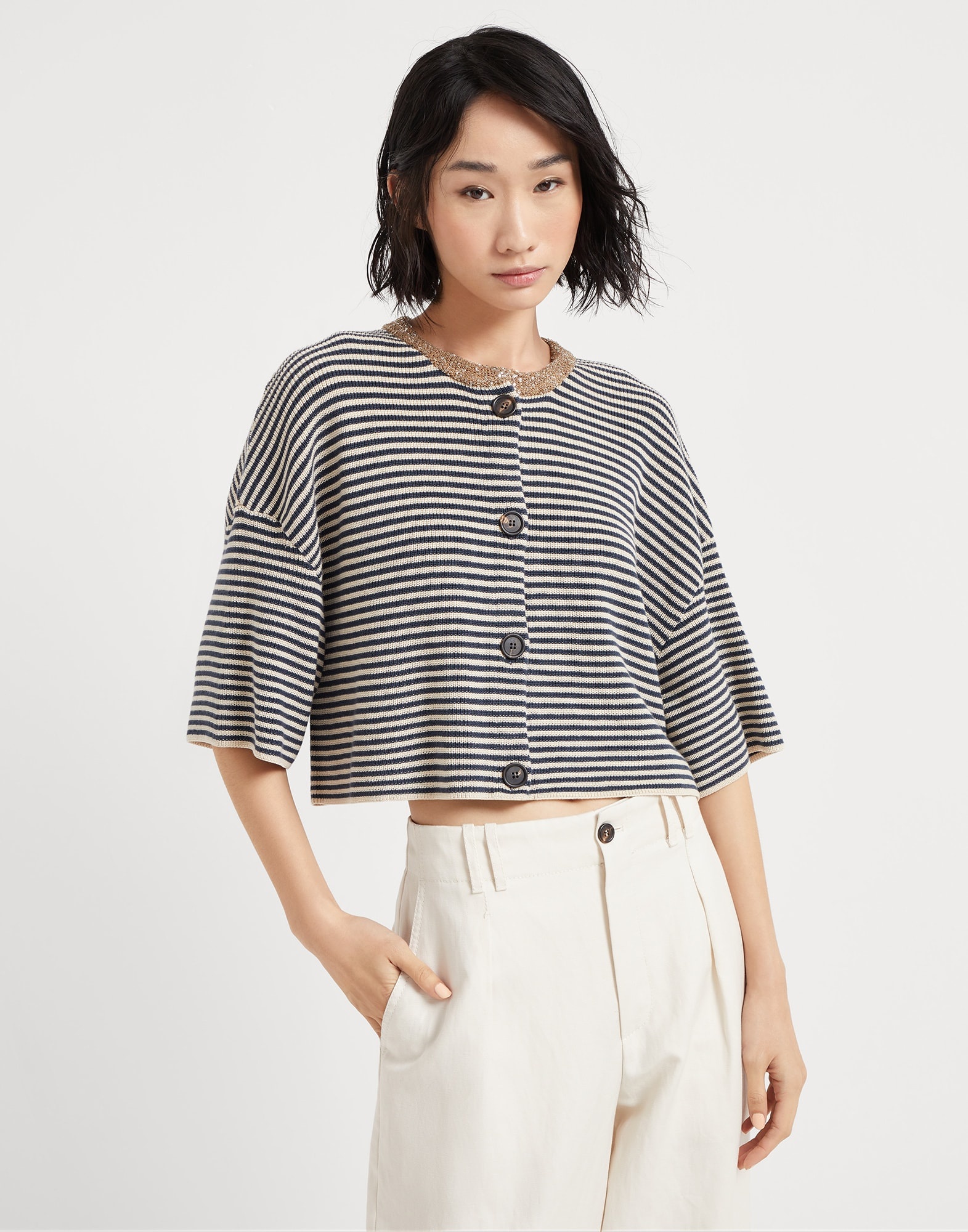The summery nature of the striped pattern enhances the effortless style of this cotton cardigan with Dazzling Collar Detail. The shiny reflections of the sequins enrich the crew neck, giving the garment an elegant, feminine note. The fit features relaxed proportions and dropped shoulders. MATERIALS Fresh, lightweight and also comfortable, the pure cotton yarn offers the right amount of protection, particularly during the transitional months and warm weather. DETAILS Horn button closure Crew-neck Drop shoulder Wide sleeve Rib knit 100% COTTON