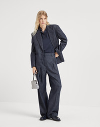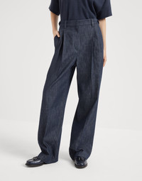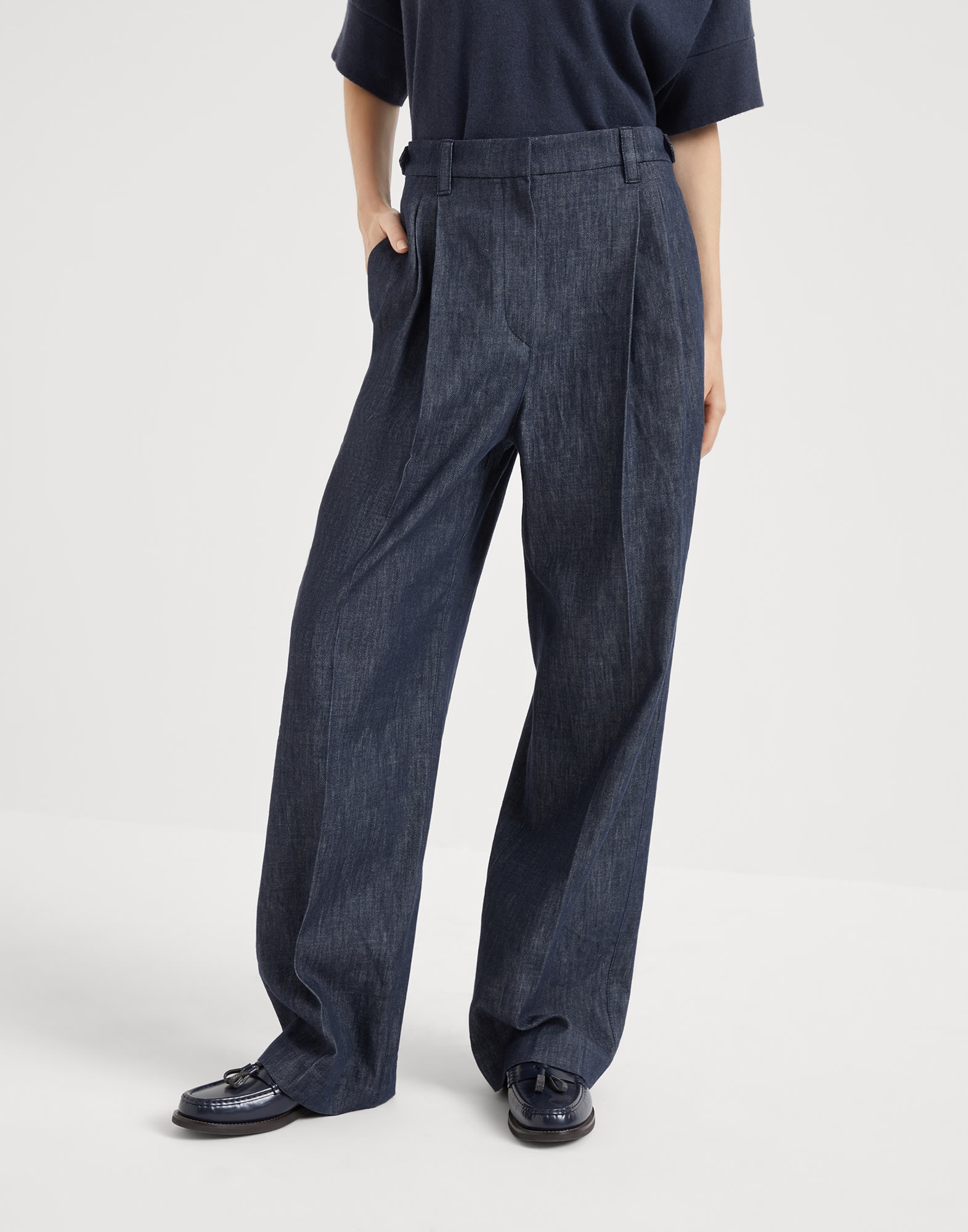 Informal volume and sartorial details come together in perfect harmony in these Relaxed Tailored trousers. The double pleats flow lightly down the entire length of the leg, emphasizing the slender silhouette, while the cotton denim-like twill gives the garment a casual feel. MATERIALS Characterized by a look reminiscent of classic denim, the pure cotton twill is a lightweight, comfortable fabric, suitable for wearing year-round. DETAILS Zip closure with metal hook and backing button Front pockets Double pleat Back pockets 100% COTTON