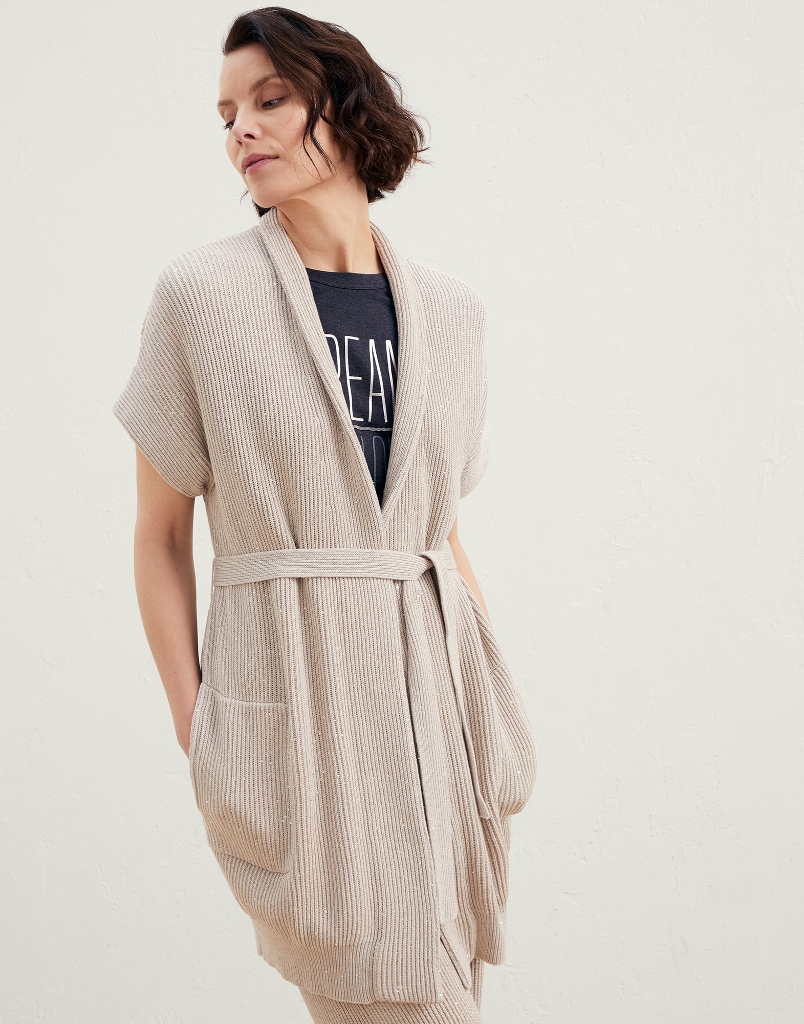 Refined and lightweight materials rework the traditional inspiration of this cardigan with a feminine twist. The Diamond cotton yarn is enhanced by classic and casual English rib knitting, while little sequins incorporated into the yarn spread subtle sparkling reflections onto the garment’s surface. A waist tie belt gathers the comfortable fit, characterized by deconstructed shoulders and straight proportions. MATERIALS The manufacturing of lightweight Diamond yarn combines the fresh, natural touch of pure cotton with small paillettes incorporated into the yarn, spreading delicate sparkling reflections on the surface of the piece. DETAILS Unstructured shoulder Detachable belt English rib Patch hand pockets 96% COTTON, 4% POLYESTER