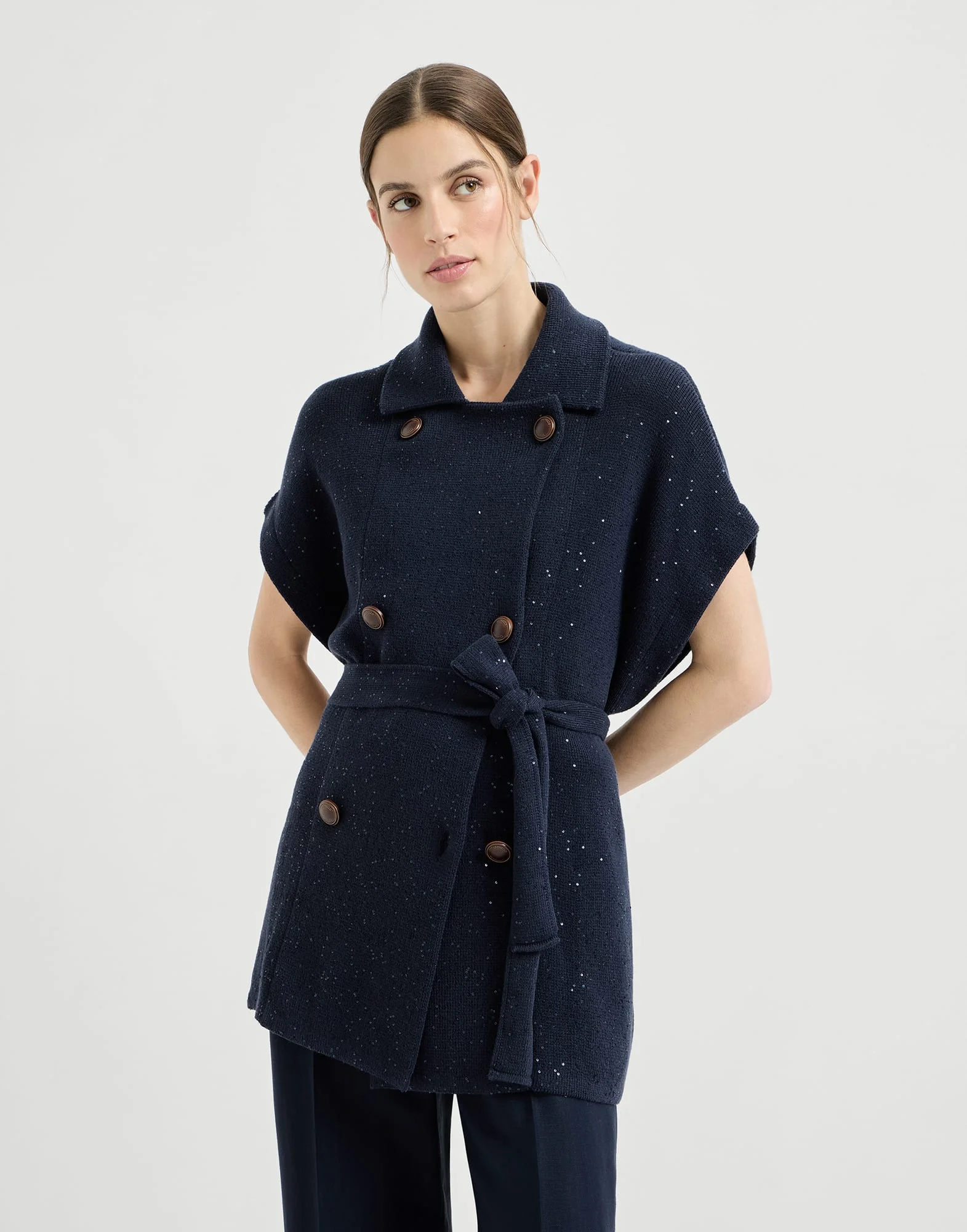 This cotton Diamond yarn knit vest reimagines tailored style in a relaxed, feminine way. The double-breasted construction, completed by the lapel collar, evokes the classic lines of men's outerwear, while the comfortable texture of the knit is enriched with the delicate shimmer of sequins. The belt gathers the volume and highlights the waist, creating a sense of effortless elegance. MATERIALS The manufacturing of lightweight Diamond yarn combines the fresh, natural touch of pure cotton with small paillettes incorporated into the yarn, spreading delicate sparkling reflections on the surface of the piece. DETAILS Button closure Adjustable belt with loops Shirt-style collar Vertical hand pockets Half English rib 96% COTTON, 4% POLYESTER