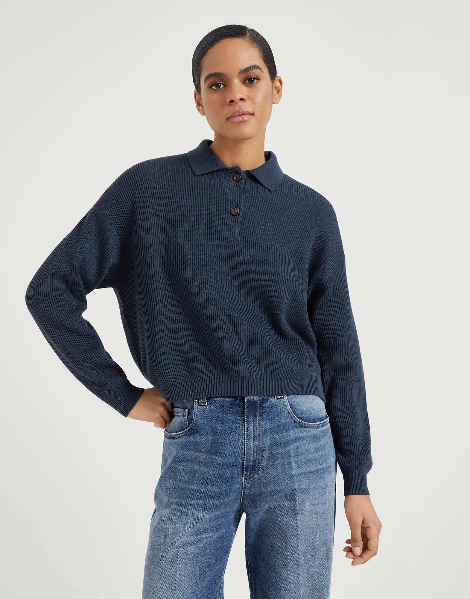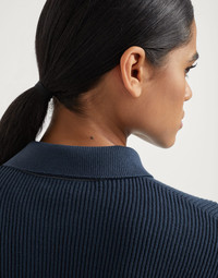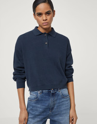 Inspired by the polo shirt, classic lines embrace feminine details in this new cotton sweater. The traditional English rib knitting stands out on the light, fresh fabric to create a timeless piece. Almost hidden, a fine row of precious monili embroidery adds an unexpected sparkle on the back of the neck. The dropped shoulders complete the sweater’s relaxed, comfortable look. MATERIALS Fresh, lightweight and also comfortable, the pure cotton yarn offers the right amount of protection, particularly during the transitional months and warm weather. DETAILS Shirt-style collar with button opening Drop shoulder English rib Nickel-free monili decoration 100% COTTON