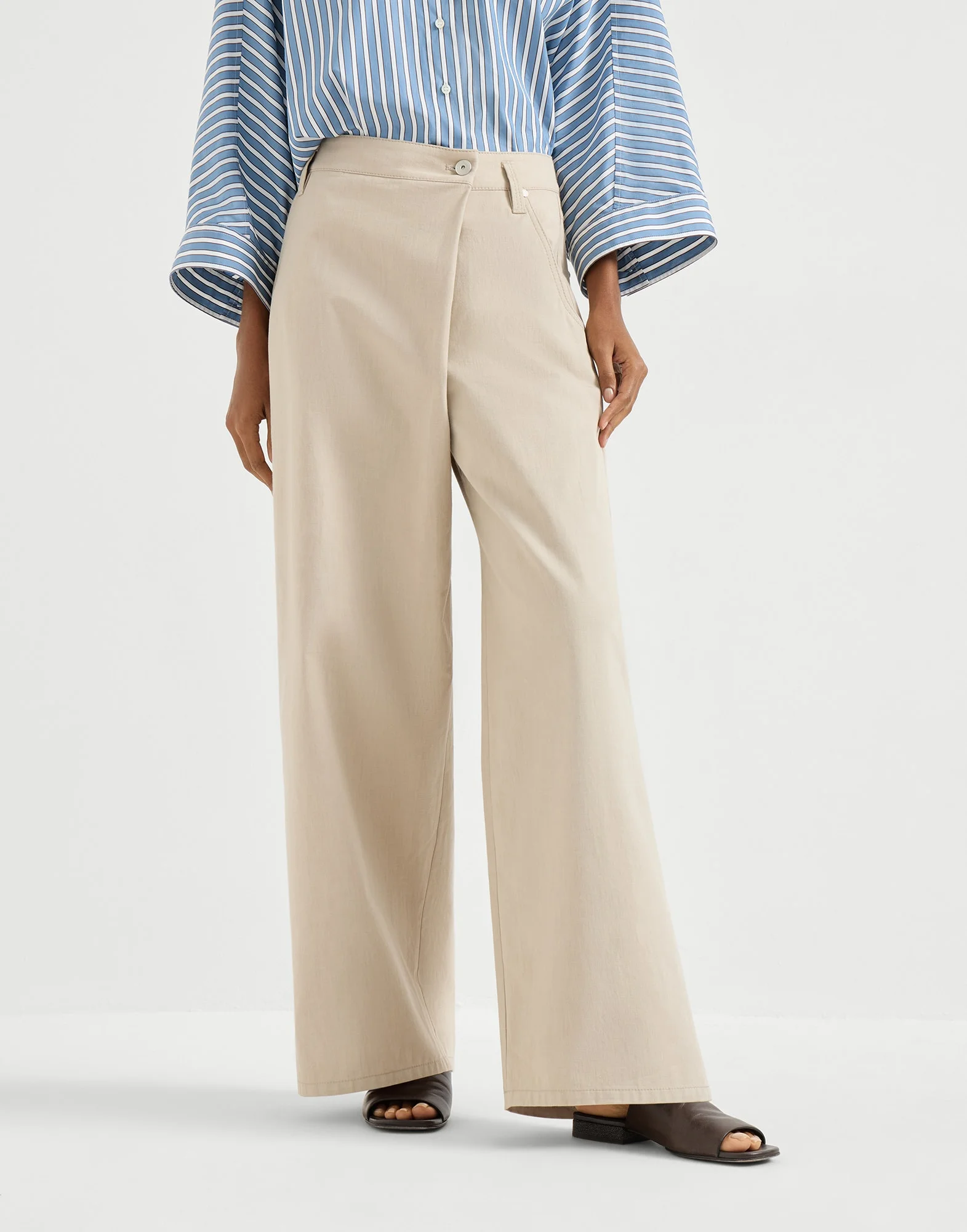 A tribute to a clean Japanese aesthetic, these loose wrap trousers stand out for their very sophisticated silhouette. The cotton gabardine complements the "wrapping” design that evokes a samurai-like style, reimagined in a contemporary, feminine way. The five-pocket detail introduces a casual note, while a shiny monili embroidery illuminates the garment with a delicate sparkle. MATERIALS Pure cotton gabardine uses a very twisted refined yarn that creates a slightly three-dimensional appearance. DETAILS Button closure with backing button Front pockets with watch pocket Back patch pockets Plain hem Nickel-free monili decoration 100% COTTON