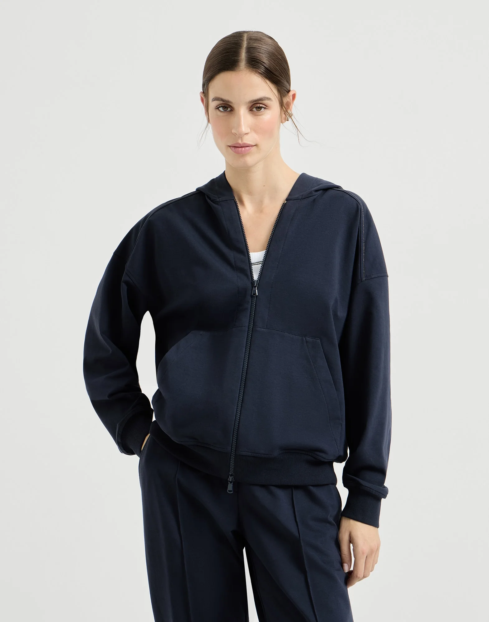 Stretch cotton lightweight French terry hooded sweatshirt with zipper and shiny trims