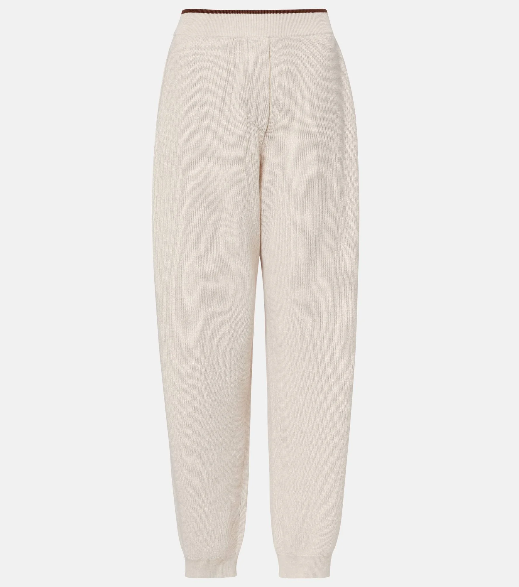 Brunello Cucinelli's designs are created in Solomeo, a medieval hamlet whose art and traditions are woven into the house's every fiber. This pair of cotton jersey sweatpants has rounded legs that taper gently towards the ankles. Product Details - Material: 100% cotton - Care instructions: hand wash - Made in Italy - Color: white - Designer color name: Avena+Cacao - Elasticated waistband - Pockets: side slit pockets - Item number: P01143611 Size & Fit - True to size - Elasticated waist - Slightly stretchy fabric - Tapered leg - High-waisted - The model seen in the picture is 178cm-5'10" and wearing a size XS