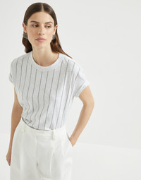 Casual style and shimmering elements define the look of this new cotton T-shirt with dazzling chalk stripe embroidery. The refined chalk stripe pattern, inspired by the world of masculine elegance, is created with an embroidery of shiny sequins, elevating the sporty attitude with a feminine sparkling note. The garment features regular proportions completed by the classic crew-neck and short sleeves. MATERIALS Research on the best materials elevates the sporty flavor of the pure cotton jersey inspired by the male wardrobe. The fabric is comfortable, lightweight and extremely pleasing to wear, perfect for every season. DETAILS Crew-neck 100% COTTON