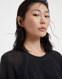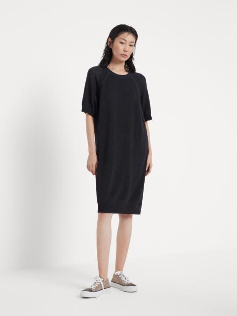 A soft silhouette is paired with refined Brunello Cucinelli materials and elegant details in this new cotton knit dress. Rib knit details on the crew-neck, bottom band and cuffs create a sophisticated contrast with the garment’s surface, completing the relaxed style of the dress. A detail of the season made of rows of shiny monili finishes the look with a radiant sparkling touch. MATERIALS Pure cotton yarn is twisted to offer a very lightweight and compact texture. DETAILS Crew-neck Rib knit cuffs and bottom band Plain stitch Nickel-free monili decoration 100% COTTON