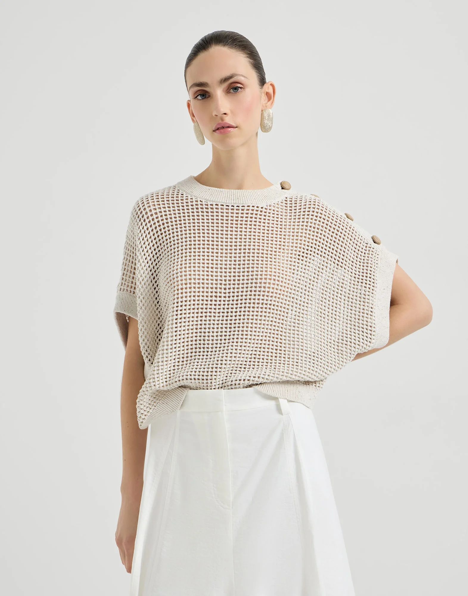 Precious elements and nautical inspiration come together in this cotton net sweater with dazzling details. The classic net-like stitch provides the garment with lightness and airiness, while a cascade of shimmering sequins introduces a delicate sparkling note that enhances the essential silhouette. The design’s comfortable proportions with dropped shoulders and wide sleeves convey a relaxed elegance. MATERIALS The cotton yarn is delivered in refined, airy, net-like knitting. The sequin detail embellishes the yarn’s essential nature. DETAILS Opening with buttons on shoulder Rib knit crewneck Unstructured shoulder Ribbed bottom band Net knitting 96% COTTON, 4% POLYESTER
