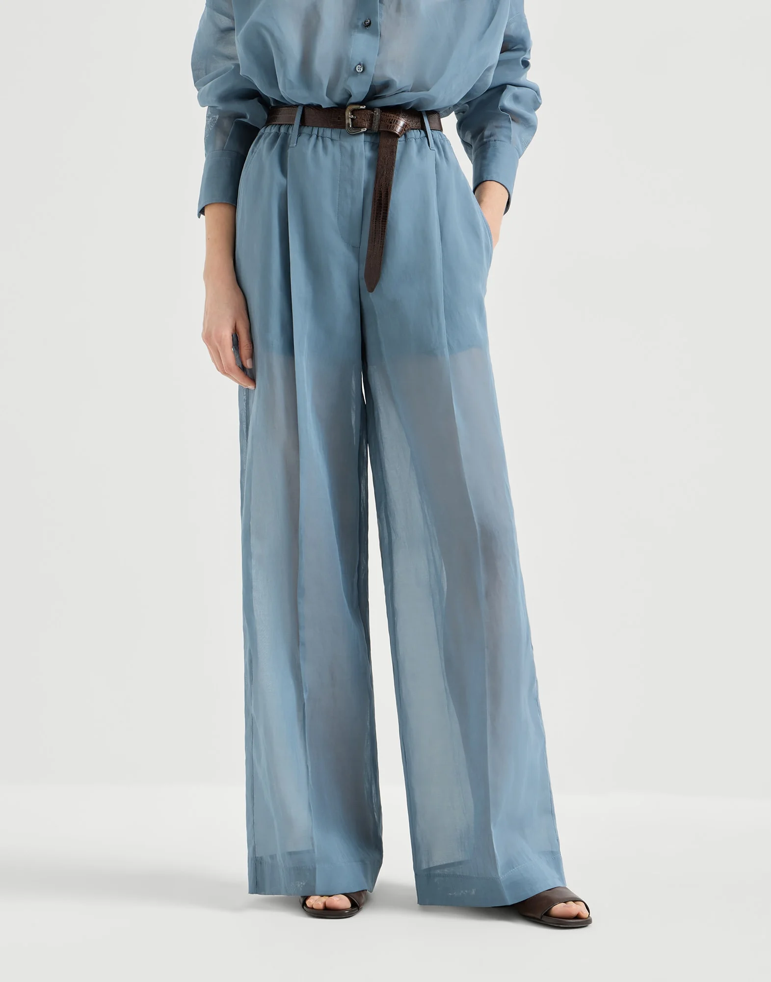 These cotton organza sartorial track trousers convey the perfect dialogue between the world of the classics and a contemporary attitude. With its ethereal sophistication, the fabric complements the garment’s fluid lines, emphasizing its movements in a harmonious, feminine way. The pleat runs lightly down the leg giving the design a sophisticated structure. The iconic shiny monili embroidery adds a delicate sparkle in true Brunello Cucinelli style. MATERIALS The finish of the ultra lightweight cotton organza gives the texture a crisp and slightly irregular effect. DETAILS Zip closure with metal hook and backing button Elastic waistband Slanted front pockets Pleat Back welt pockets Half-lined in silk-blend crepe Plain hem Nickel-free monili decoration 100% COTTON