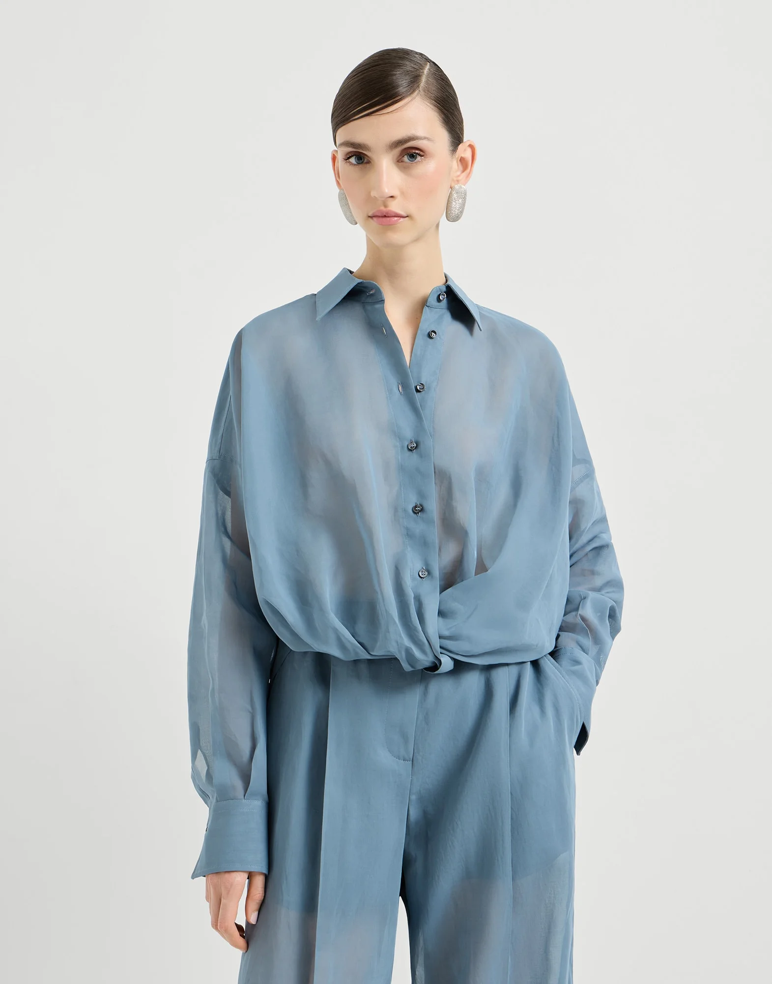 Casual details and refined materials come together in this cotton organza shirt. The feminine silhouette and the lightweight, semi-sheer fabric are combined with the masculine inspiration of the garment, defined by soft draping at the bottom and a cropped cut. The monili embroidery completes the shirt with an elegant sparkling note in true Brunello Cucinelli style. MATERIALS The finish of the ultra lightweight cotton organza gives the texture a crisp and slightly irregular effect. DETAILS Classic collar Drop shoulder Cuffs have one mother of pearl button Nickel-free monili decoration 100% COTTON