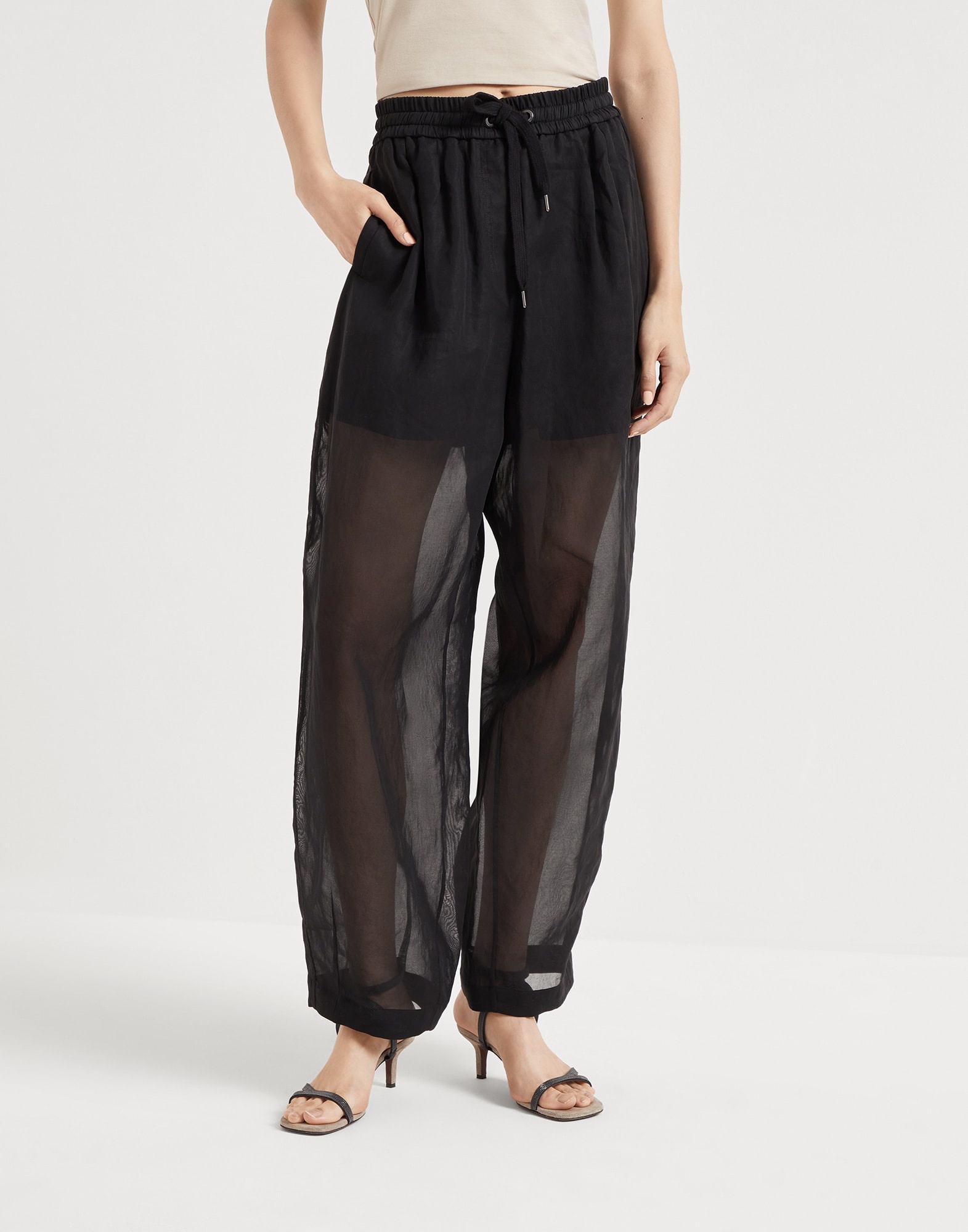 A soft, curvy silhouette is paired with refined summery fabrics in these new Track trousers. The lightness of the cotton organza gives the garment a distinctly feminine feel, while the practical drawstring waist highlights the relaxed fit. The front and back patch pockets provide added comfort. MATERIALS The finish of the ultra lightweight cotton organza gives the texture a crisp and slightly irregular effect. DETAILS Pull-up trousers with drawstring Front pockets Back pockets Half-lined 100% COTTON