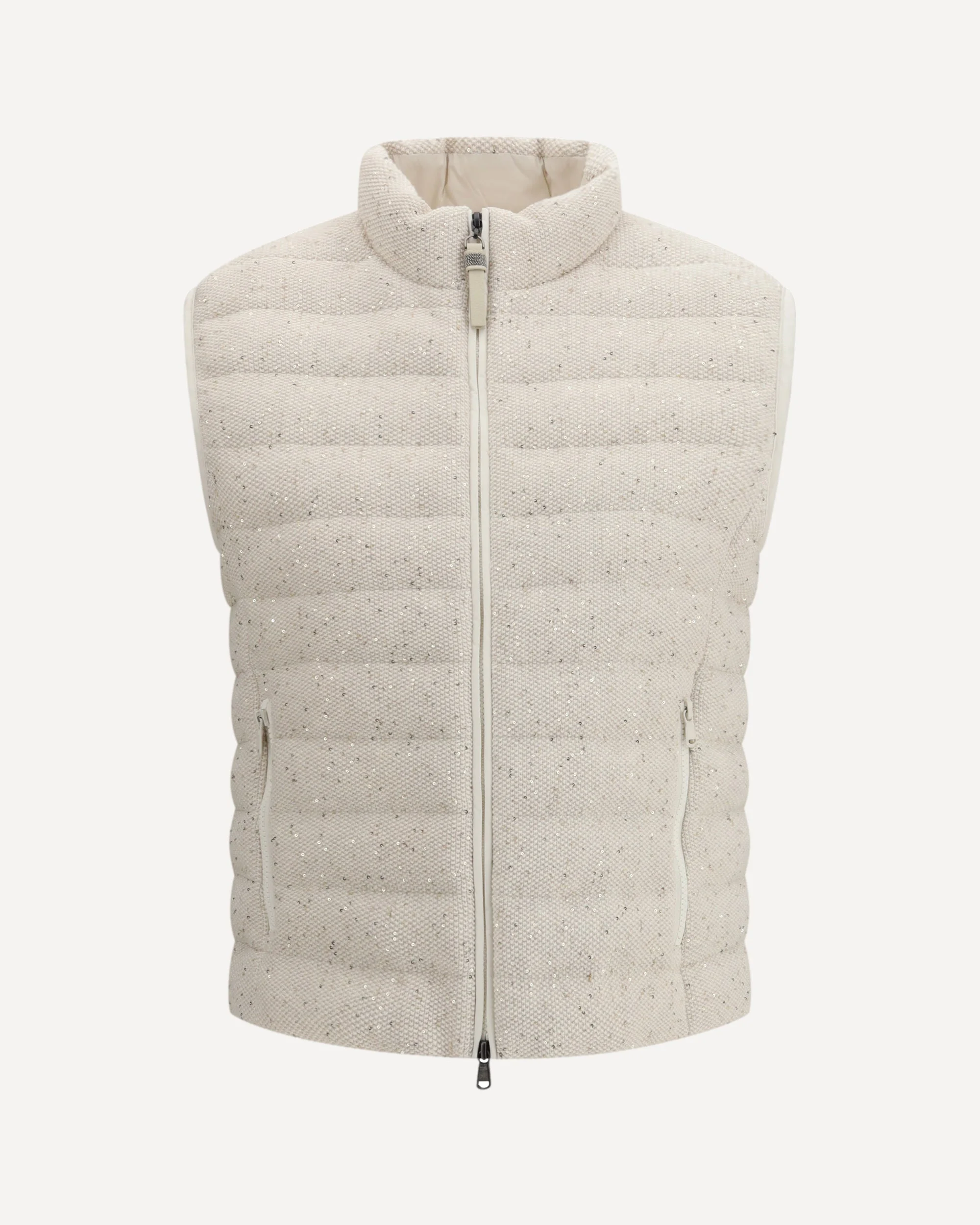 The cotton padded Vest with sequins by Brunello Cucinelli is a unique garment that combines functionality and elegance. The high collar and double-slider zip closure at the front offer extra protection, while the side zip pockets add practicality. The adjustable drawstring hem allows you to customize the fit. The sequin-applied fabric gives the vest a touch of sophisticated shine, making it ideal for adding a touch of glamour to a casual or sporty look. DETAILS - Sku: M0DVT7776_CTK25 - Season: SS26 - Fit: Regular - Composition: INNER 100% Goose Down OUTER 4% Polyester 96% Cotton - MADE IN ITALY