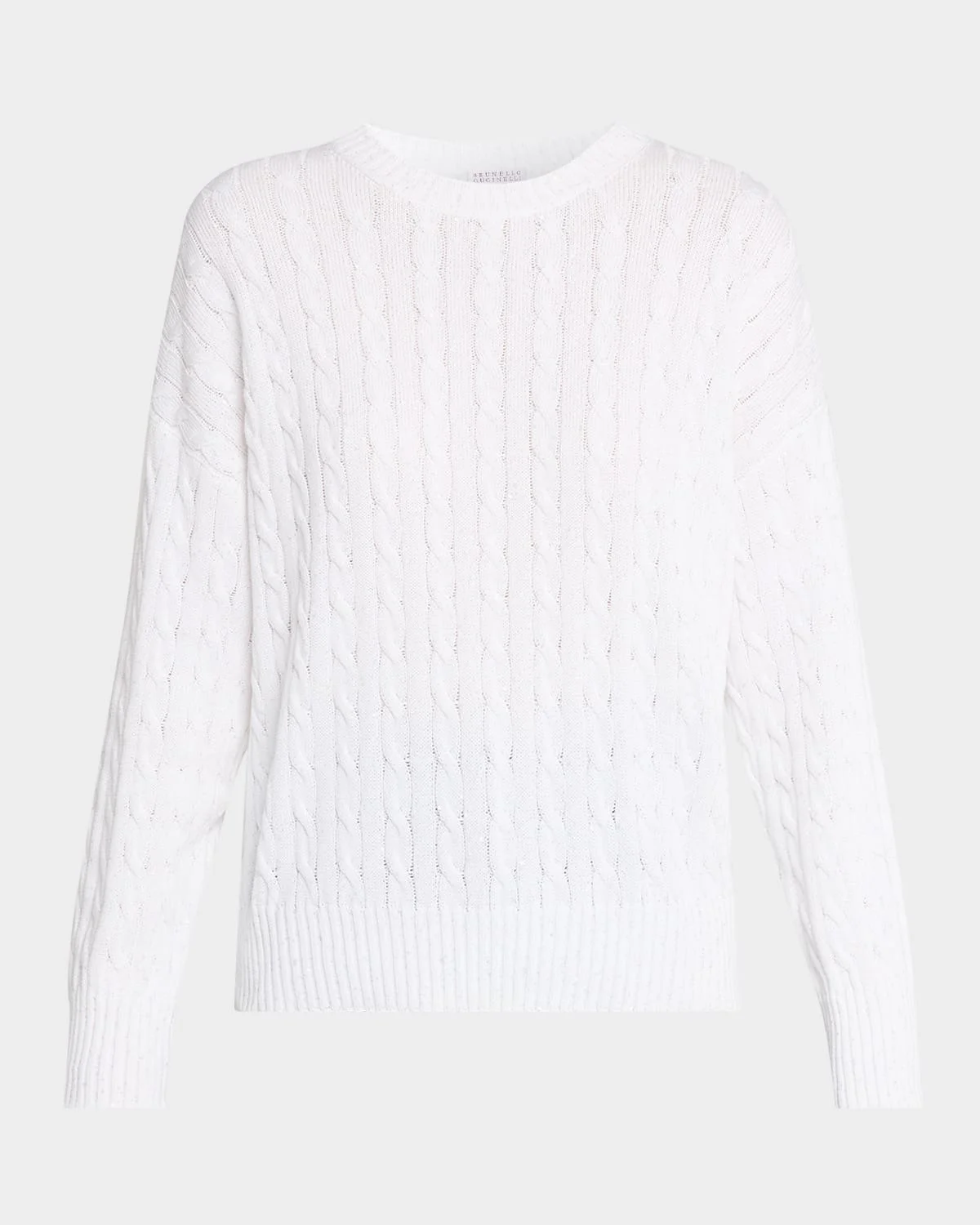 The sweater from Brunello Cucinelli is crafted from cotton paillette cable knit Crew neckline Long sleeves Drop shoulders Loose fit Ribbed cuffs and hem Pullover style Cotton/polyester Dry clean Made in Italy