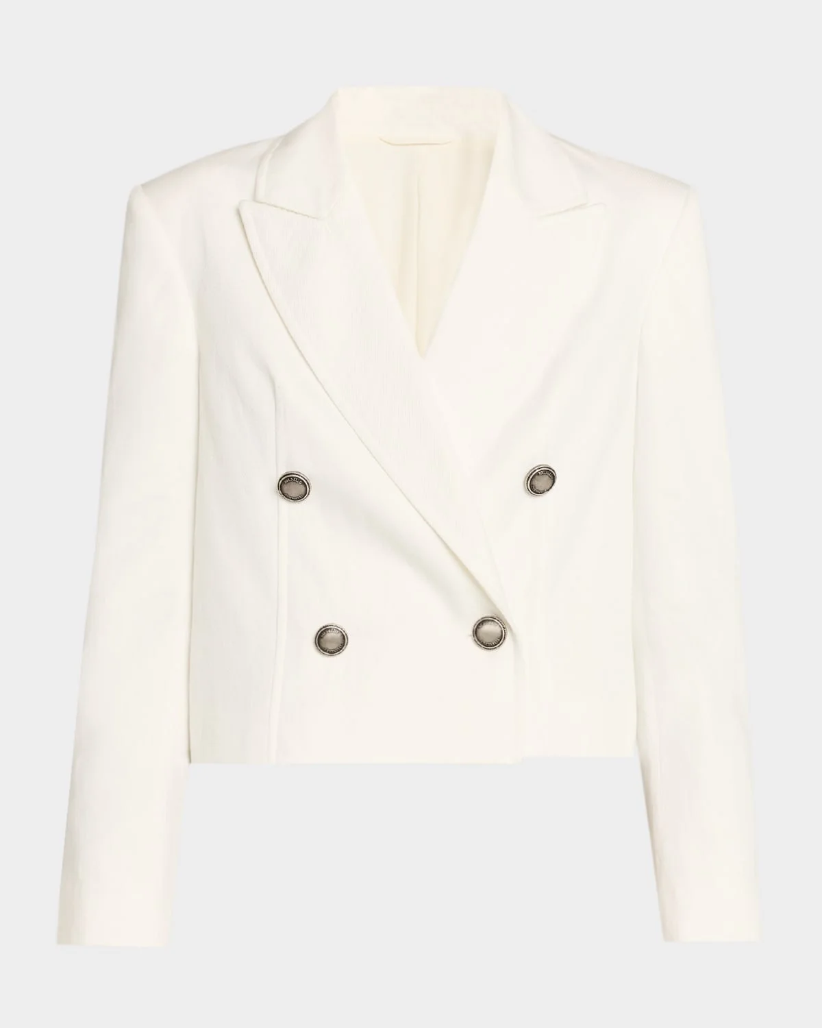 Crafted from cotton paper twill, this jacket from Brunello Cucinelli features logo buttons and structured shoulders Peak lapels; double-breasted front Long sleeves; button cuffs Straight fit Hip length Button closure Cotton/paper Lining: Acetate/silk Made in Italy