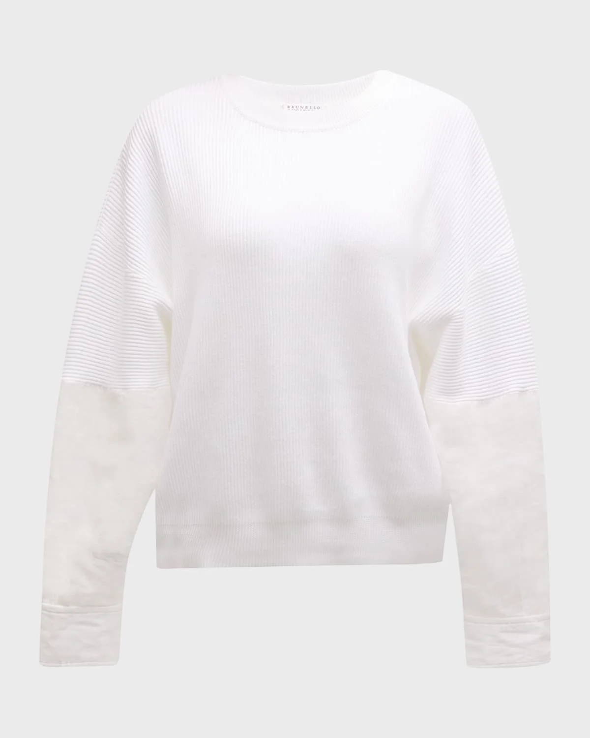 Cotton Ribbed Crewneck with Organza Sleeve Detail