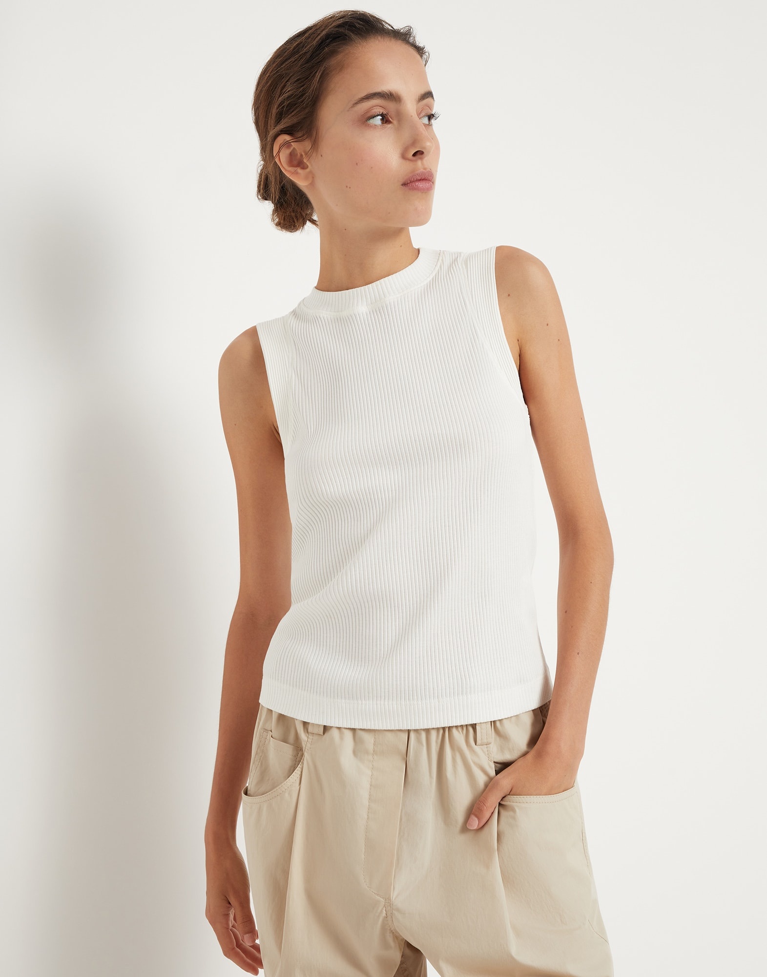 Essential, versatile and comfortable, this new cotton ribbed jersey top is a basic garment to create your own outfits. The ribbing gives the piece an elegant look, while the fine row of shiny monili behind the neck adds a delicate sparkling note and a feminine touch to this top. MATERIALS Inspired by menswear, the pure cotton jersey showcases the classic ribbed texture and offers a very comfortable, lightweight and extremely pleasant hand that is perfect for any season. DETAILS Crew-neck Off-the-shoulder style Nickel-free monili decoration 100% COTTON
