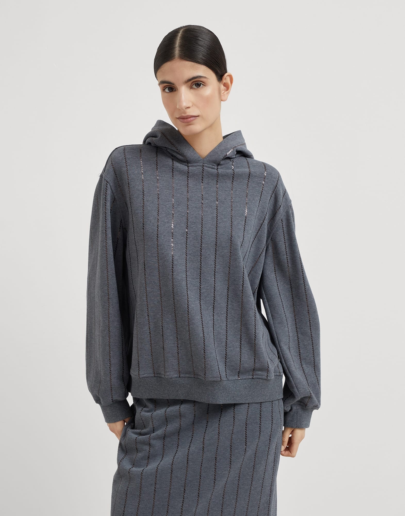 A refined mix of styles defines this sweatshirt in cotton smooth French terry with dazzling chalk stripe. Inspired by the world of masculine elegance, the chalk stripe pattern elevates the garment’s sporty lines thanks to the small sequins that spread shimmering reflections. Completed with a practical hood, the sweatshirt features soft volume gathered by classic ribbed trim. MATERIALS Cotton smooth French terry features an extremely soft hand that alternates with the three-dimensional texture of shiny sequins. DETAILS Hood Rib knit cuffs and bottom band 100% COTTON